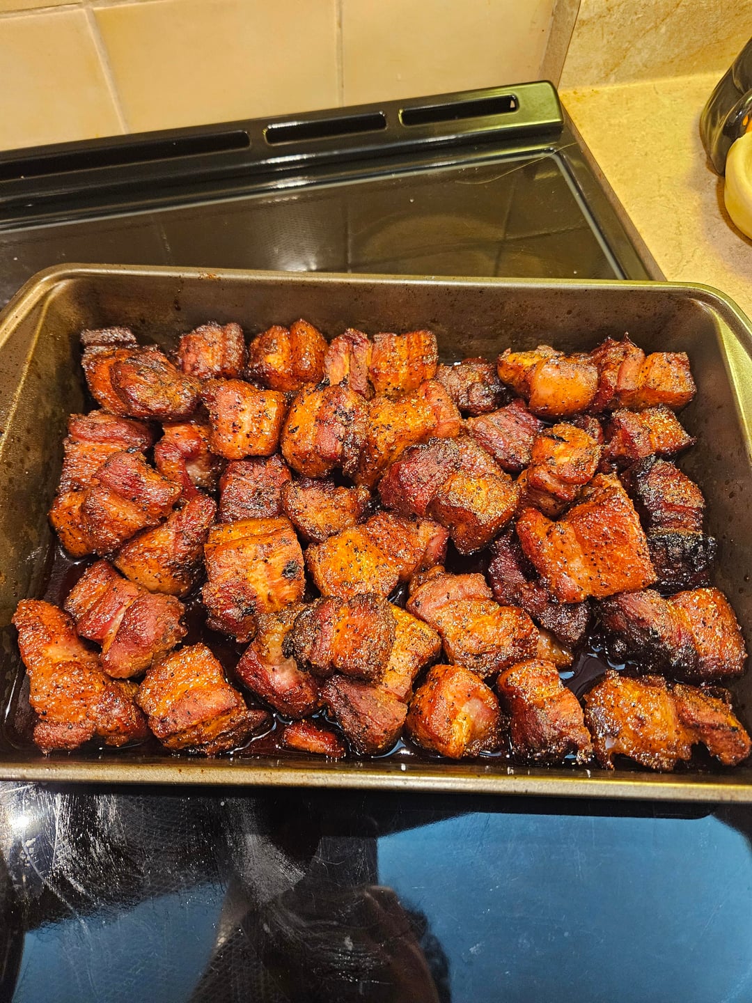 I think it’s prob a lot easier to use Chinese technique after you smoke it for 2 hours. Chinese red braised pork. Prob finish the whole thing with another 40 min. Basically pan fried to get the crunchiness, braise it, then sauce it and reduce the sauce to serve