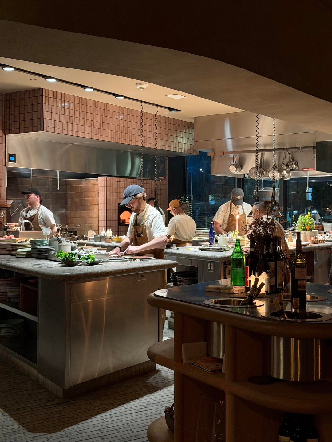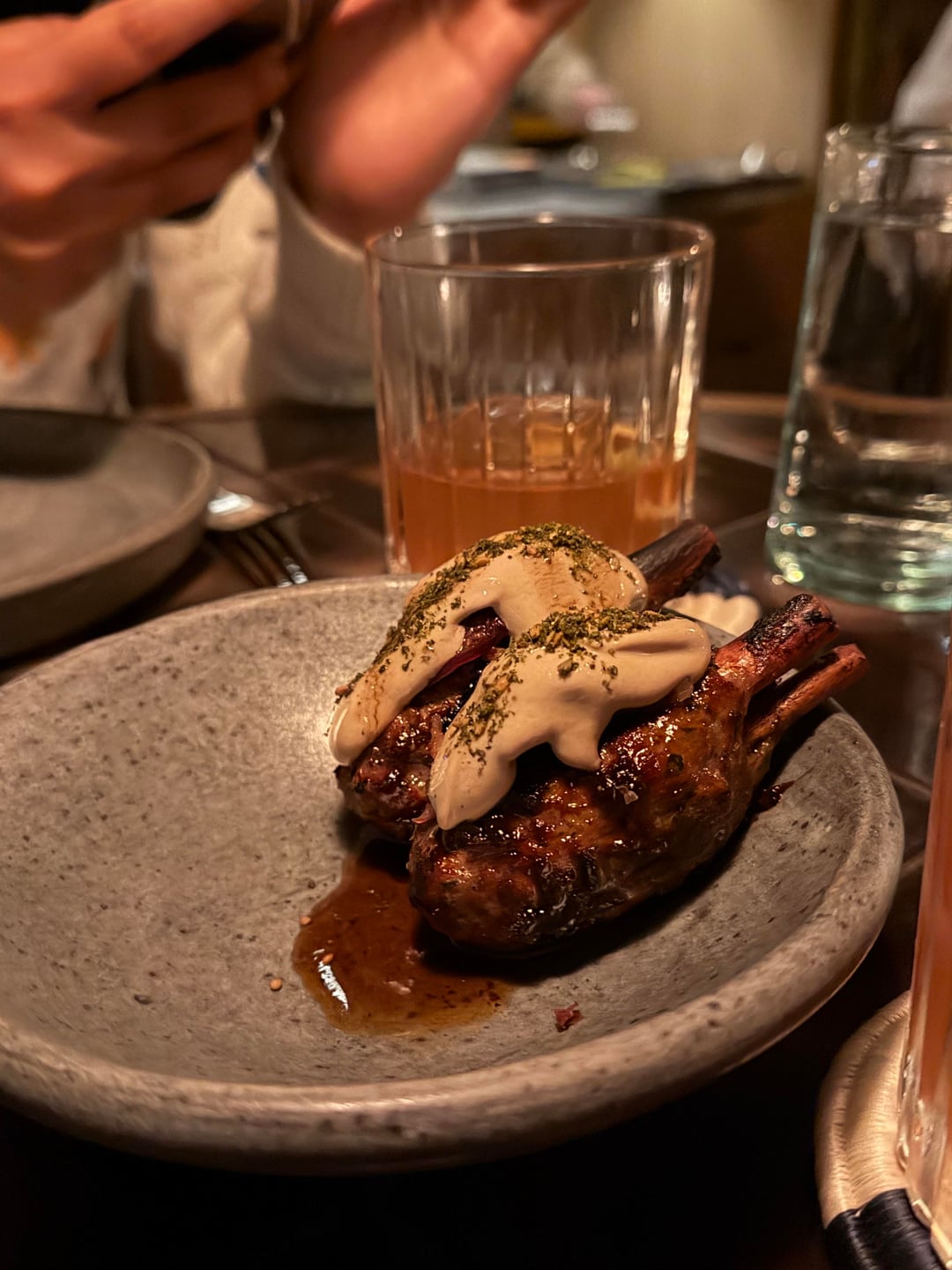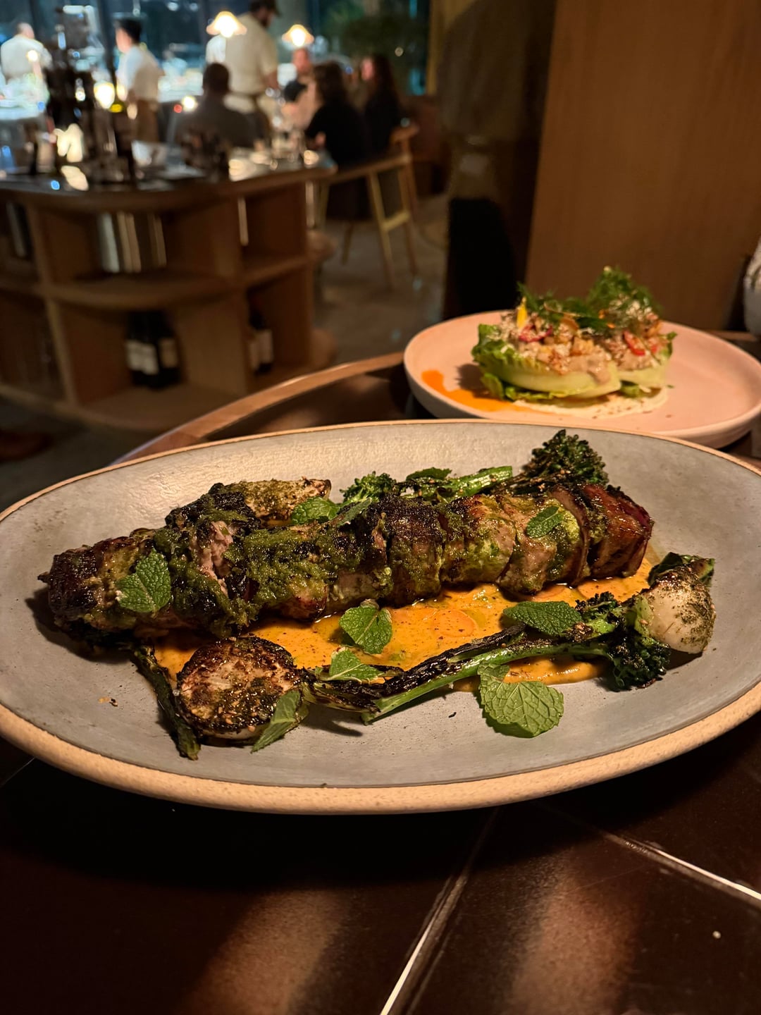 The Lamb Kabob from the mashawi section was a showstopper: tender loin and smoked belly marinated in dill yogurt, layered over carrot mutabal with fermented chili honey and charred turnips. Every element felt deliberate and beautifully executed, and very shareable.