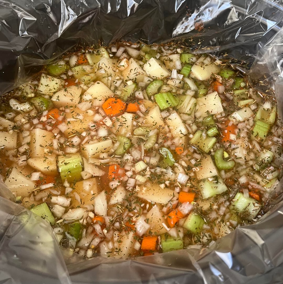 Seasonings: 2 tsp salt, 1/2-3/4 tsp black pepper, 1 tsp paprika, 1 tsp thyme, 1/2 tsp rosemary, 1/2 tsp parsley, 1/8 tsp red pepper flakes, 3 bay leaves. Leave out red pepper flakes if don’t like.