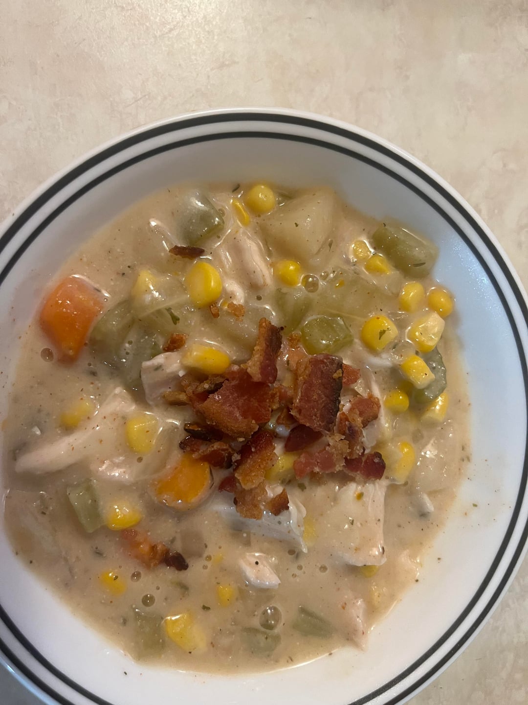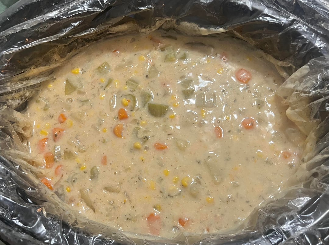 All in crockpot at once except corn and half and half (first photo). Corn put in halfway through. Low 6 hours. Turn to high. Add half and half/cornstarch. High 30-45 mins.