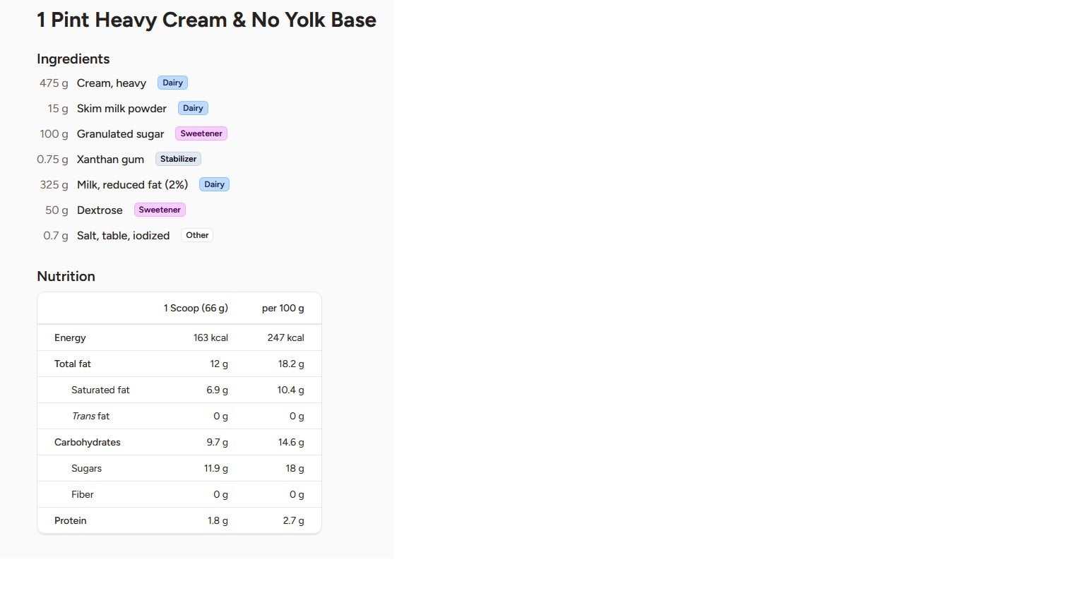 hi there, i've recently gotten an ice cream maker and experimenting with different base recipes. i'm based in the US and almost all of the heavy cream available at grocery stores near me come in 1 pint containers. i never have any use for the leftover cream so i based my recipe on using an entire container of heavy cream and then adjusting from there.
