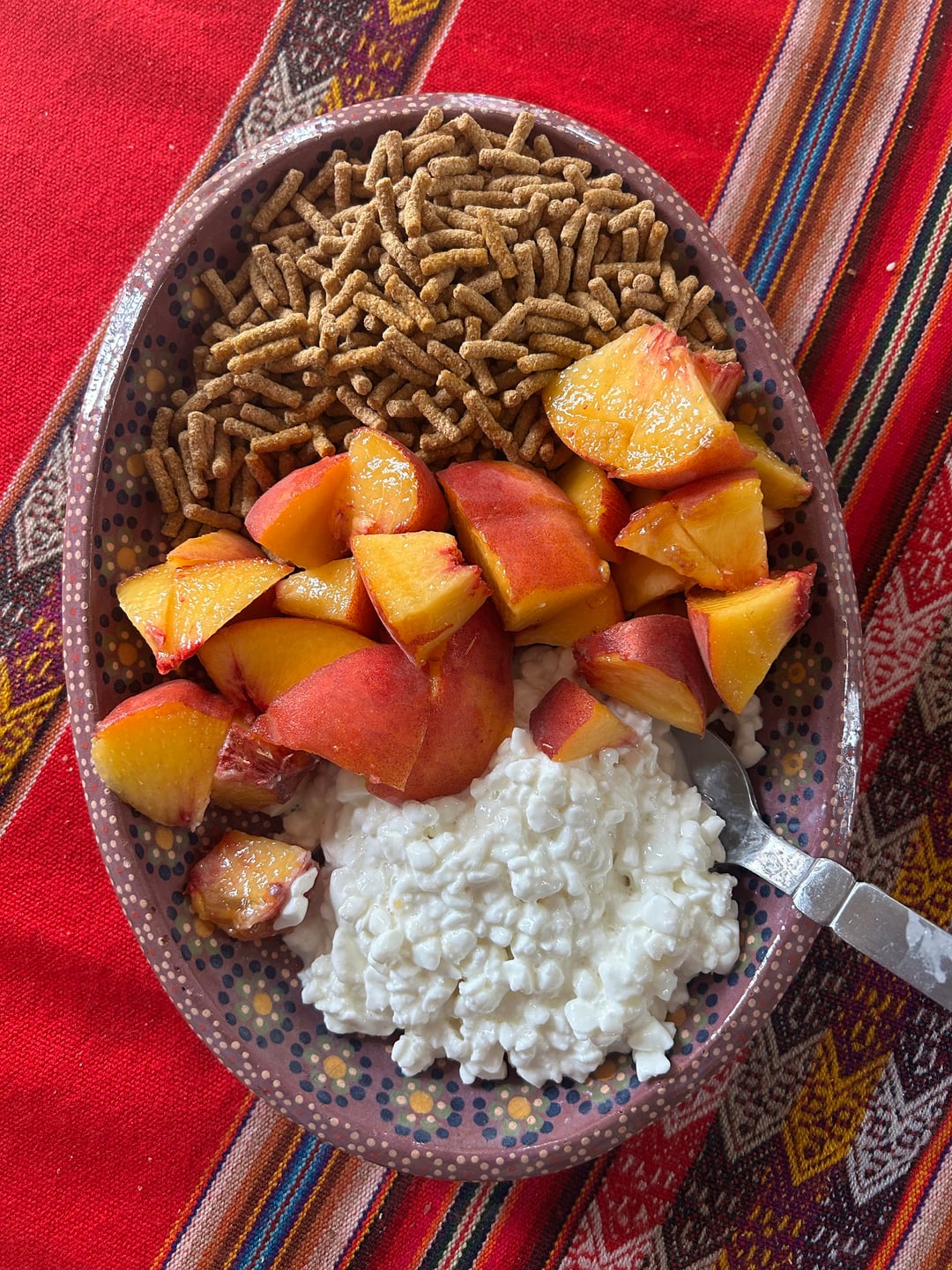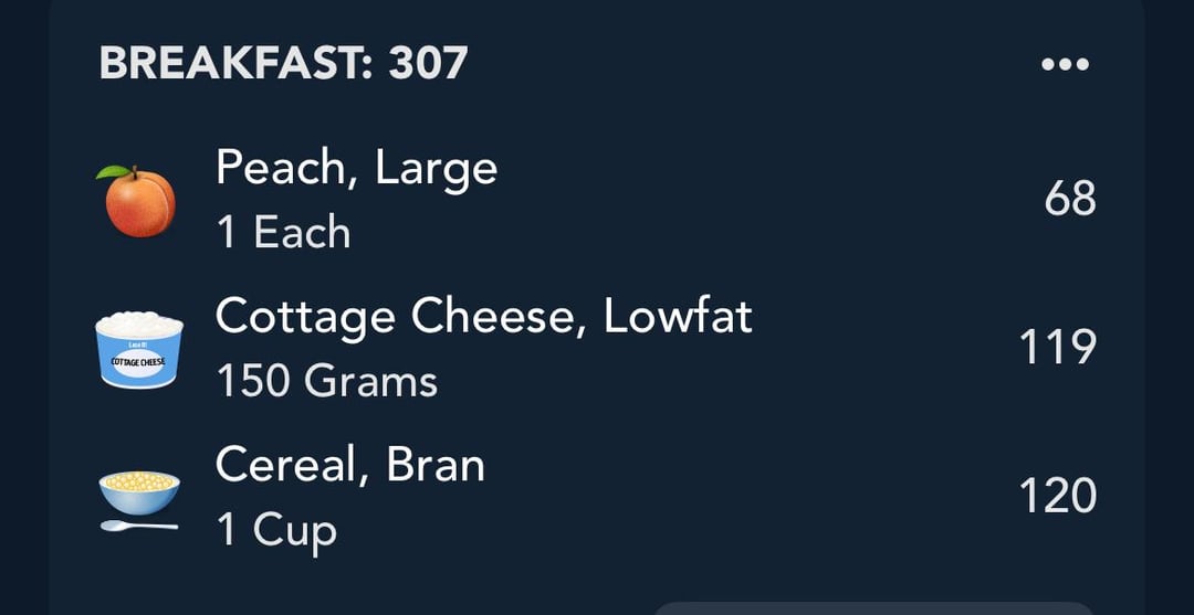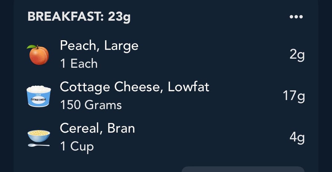 An entire peach, 150g cottage cheese, and a cup of Fiber One.