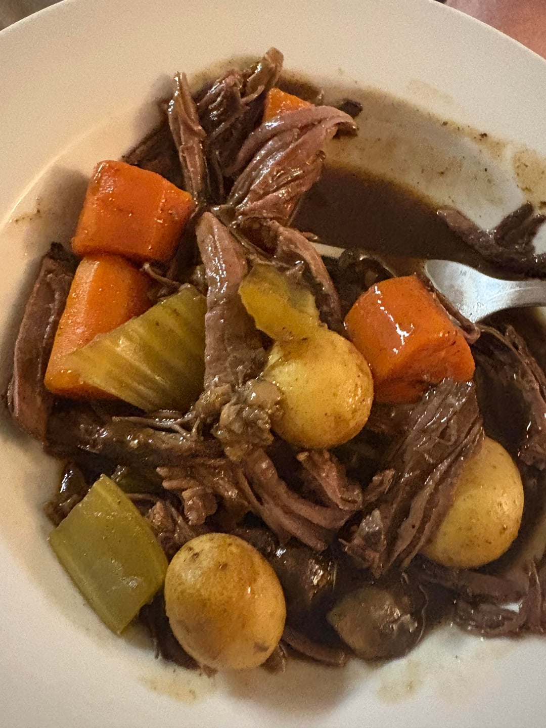 Used /u/Bbqdbydecaillet ‘s recipe from their post as the guide. Changed a couple things to taste. Ended up having to take the roast out about an hour and a half before the veggies were done. Also added some celery and mushrooms. But the thing is delicious.