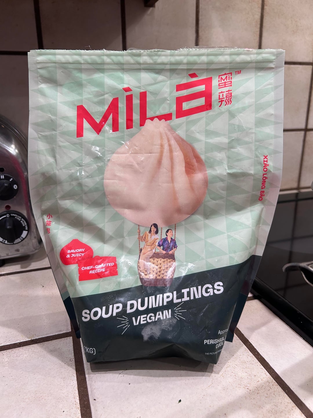 When I’m not dreaming about them, I’m daydreaming about them. This bag of frozen food has been my first exposure to soup dumplings and I’m absolutely hooked on them! The jackfruit filling is sausage-like in texture and quite tasty, and it’s swimming in a savory broth that’s already inside each dumpling, so there’s no need to add anything to them. Grocery Outlet spoiled me rotten with these things!