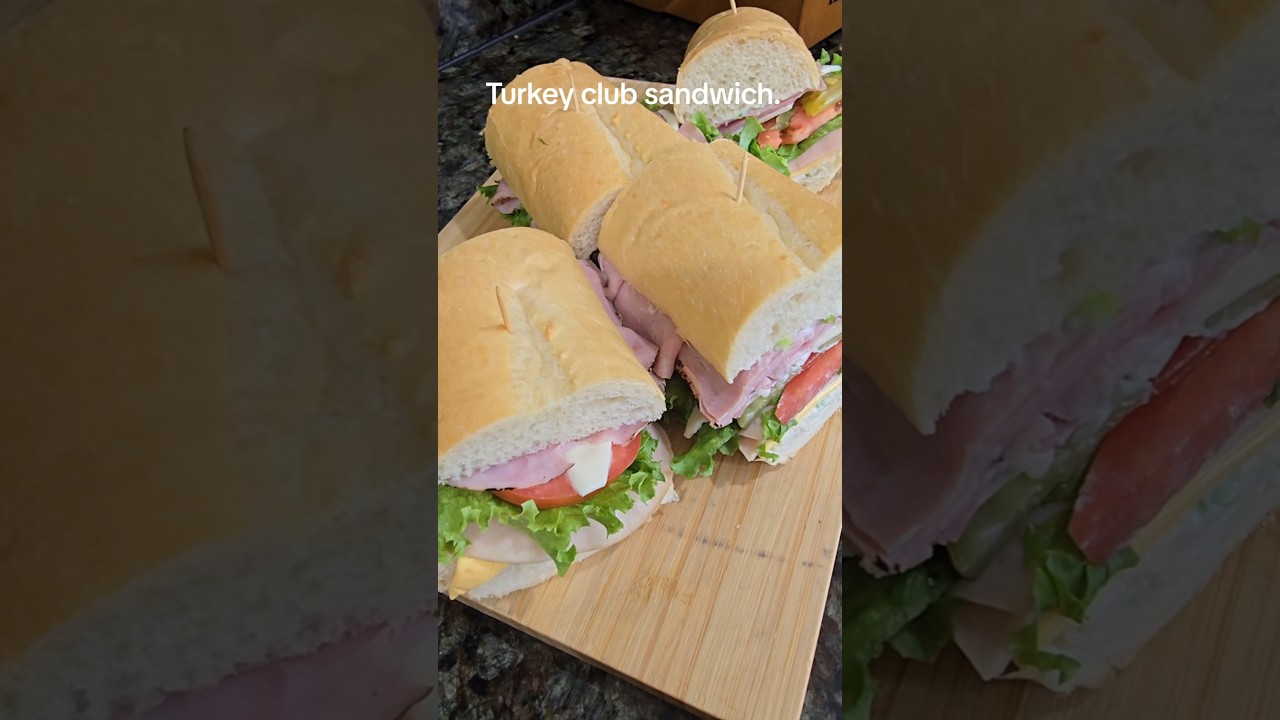 Hello everyone. Today my recipe it’s turkey club sandwich. So we need all this ingredients. I use this kind of bread. Cut it to the half. Then add the sauce. Add the yellow cheese. Sliced cheese. Then add the turkey. Slice. Sliced turkey. Lettuce. Tomato. pickles. Swiss sliced cheese. I cut it to a triangle. Then slice ham. Put this one in the top. Cut it. And then this is the result. Delicious and easy to make it.