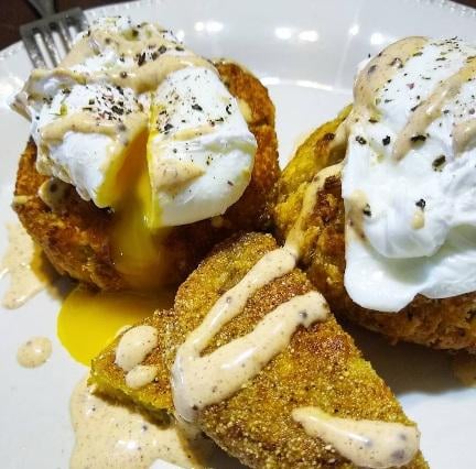 Some mornings I get extra boujee in the kitchen. Fried green tomatoes on the bottom, layered with a crab cake, then a poached egg, drizzled with a homemade remoulade sauce.