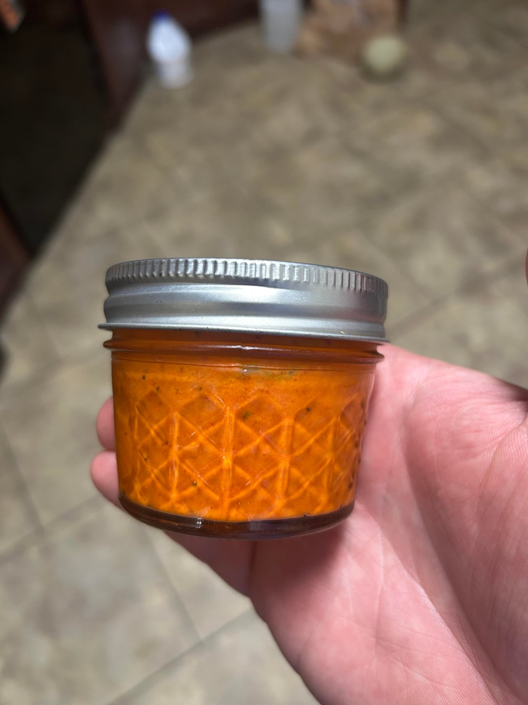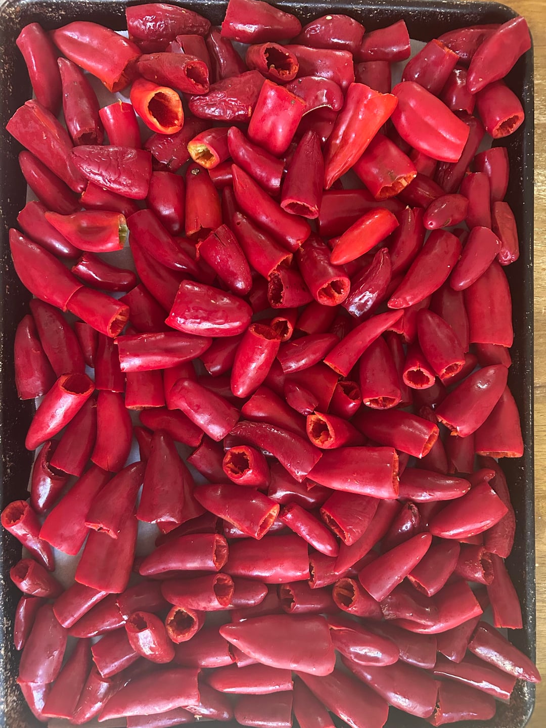 Following a Taco-Deli doña sauce copycat recipe, I de-seeded and roasted red jalapeños & red Santa Fe peppers and garlic until soft and slightly charred. Then processed in a blender with oil. Added salt to taste and water to thin down to the right consistency. Turned out pretty mild, but perfect for breakfast tacos!