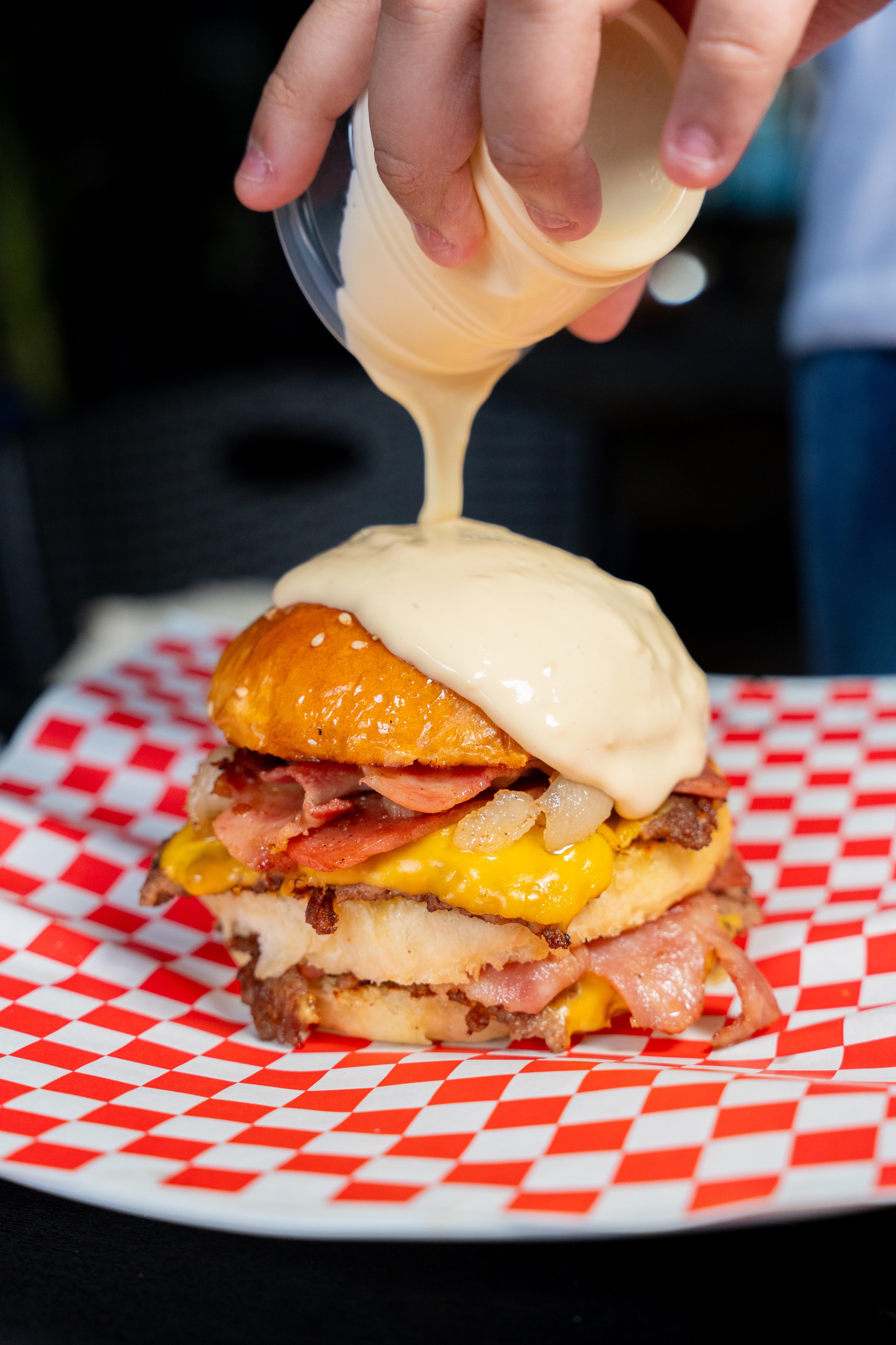 No, cut the burger and have that sauce on the side to dip, but do not pour that sauce on top!