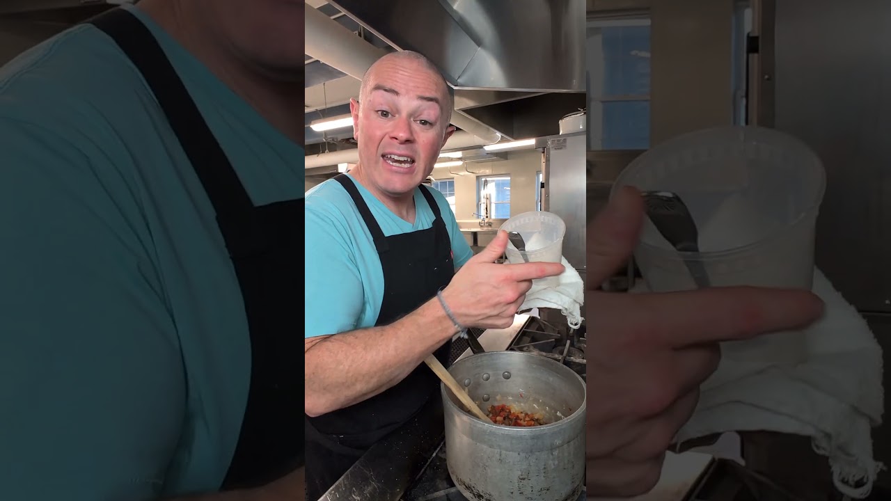 Hey, let’s make New England clam chowder because I hate to say it, but no one likes another clam chowder. And because you already follow me, you know that we cut a bell pepper once down the middle. We get rid of the seeds. I’m using the best kitchen tools I have to get rid of the seeds. Obviously, why would I want to further dull my knife? Then, you can do whatever you need to with your bell pepper. Since we’re going to small dice it for our soup, we’ll first cut it into small strips. Then, we’ll just run a knife through it. And we’ll add this to a Spanish onion that I have already small diced. We’re also going to small dice a potato. You can use any kind of potato you want. You can take the skin off, but the easiest way to do this is to cut the potato into slabs of about the size of a small dice. And if you’re a little bit nervous about cutting your potato into slabs, you can cut one end off, then flip your potato on its side like this. Now you have a flat surface to set it down. You can then cut it into the slabs that you need. Cut your slabs into sticks. Turn your sticks 90°. Then we’ll melt a couple tablespoons of butter over medium heat. And once your butter starts to foam, you’re going to add your onions and peppers. a decent pinch of kosher salt, a pinch of black pepper. After about four to five minutes, your onions and peppers will have softened. And this is about three to four pieces of bacon that I have chopped and then crisped. I know you can start this whole soup with the bacon. You can make that your first step. You chop the bacon, you render it, then you can build your soup with the bacon, even use all the bacon fat. Personally, I like to do it this way because I like the soup to be nuanced and taste all the ingredients in the soup. Sometimes I find if you start it in bacon, the whole entire thing tastes like bacon. About four to five minced garlic cloves. Let your garlic cook about 30 seconds. Then we’re going to add another 2 to three tablespoons of butter. Once all your butter has melted, we’re going to thicken this with what with what’s called a rue. And a r is just a fancy term for melted fat and equal parts flour. So if you remember, we had about five total tablespoons of butter. We’re going to put about five total tablespoons of flour. It doesn’t have to be exact. You can eyeball this. Stir this around until all of the flour gets saturated into all that butter. Once that happens, all of your vegetables are going to be coated in this paste, if you can see it. And now I’m going to add in some milk. I’m going to start with about two cups. A great way to add liquid to your r without getting lumps, is to start with a little bit. But with each addition of liquid, you’re going to let this mixture come to a simmer. But once my two cups of milk come to a simmer, I’m going to add two large cans of chopped clams and the liquid from the cans. This is about 3 lbs total. Bring this to a gentle simmer until your potatoes are fully cooked. It could take about 15 to 20 minutes. Also, in this same amount of time, that raw flour flavor is going to cook out of your R. As you stir this, it’s important to scrape the bottom of the pot and get into the corners of the pot because your R loves to stick and hang out in there. Then, we’re going to add about two cups of heavy cream, half and half, or even just more milk. Followed by some chopped thyme and parsley. Bring this back to a simmer. Give it a taste and follow me if you’re more of a fan of the other clam chowder. [Music]