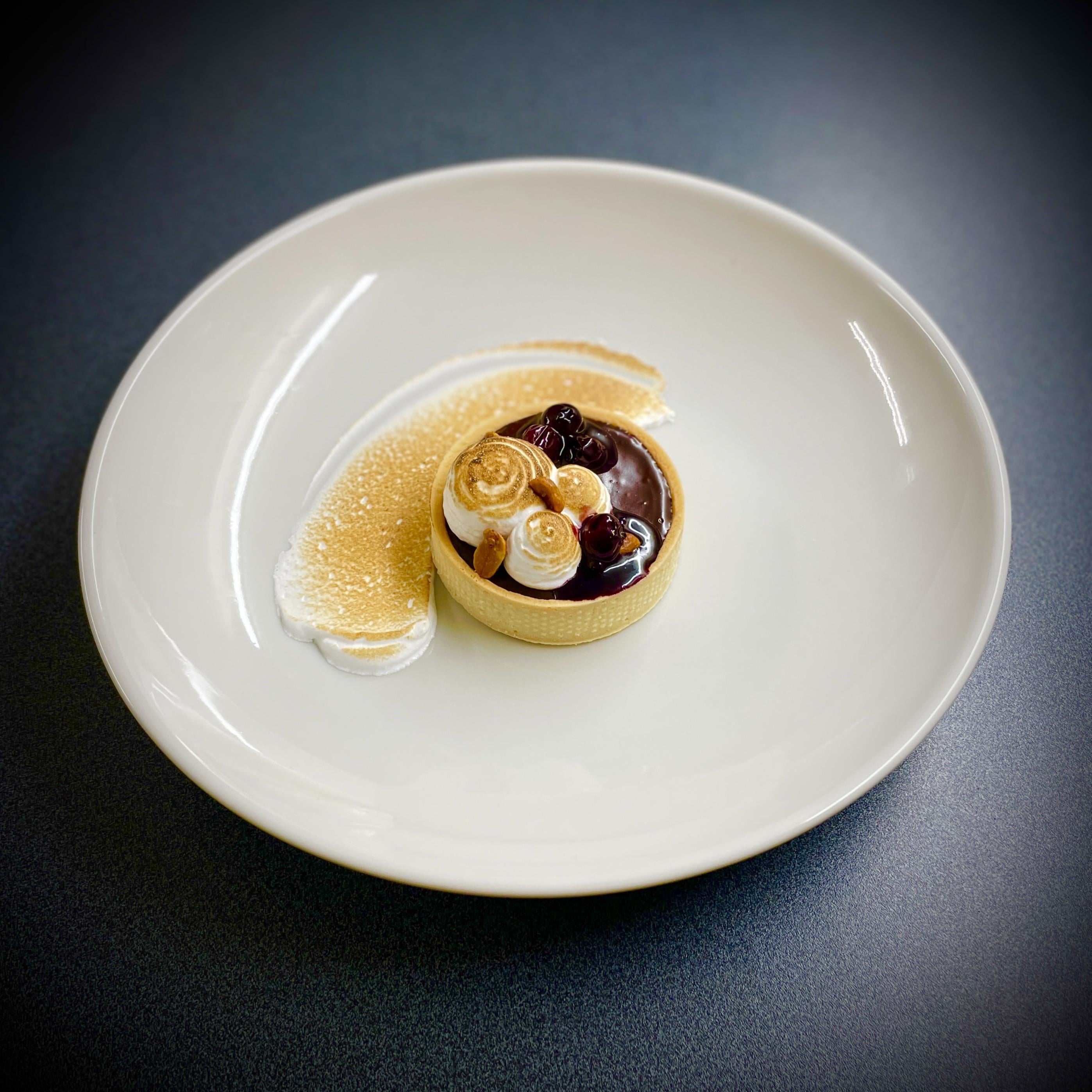 Chocolate Tart, Peanuts, Blueberries, Italian Meringue