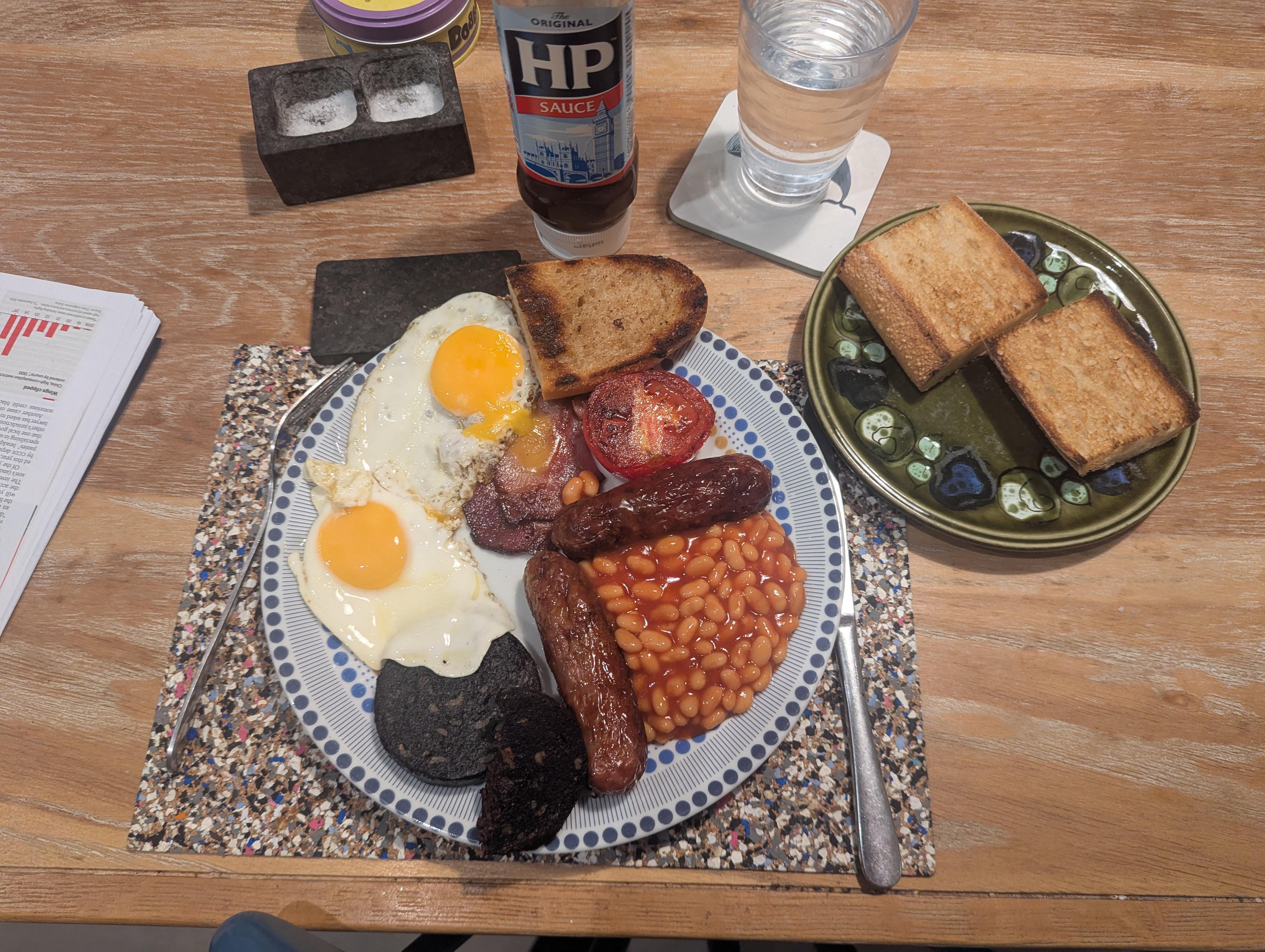 Sausage, egg, bacon, black pudding, beans, fried slice, fried tomatoes and toast to side. by TheReturningTitan Dining and Cooking