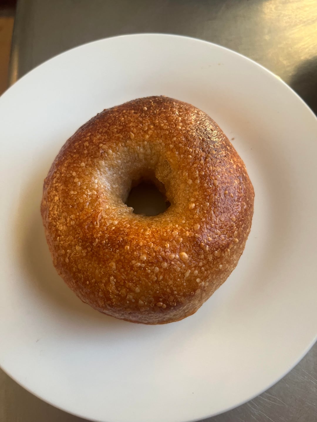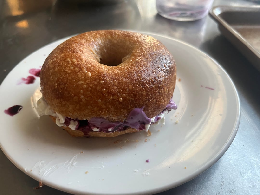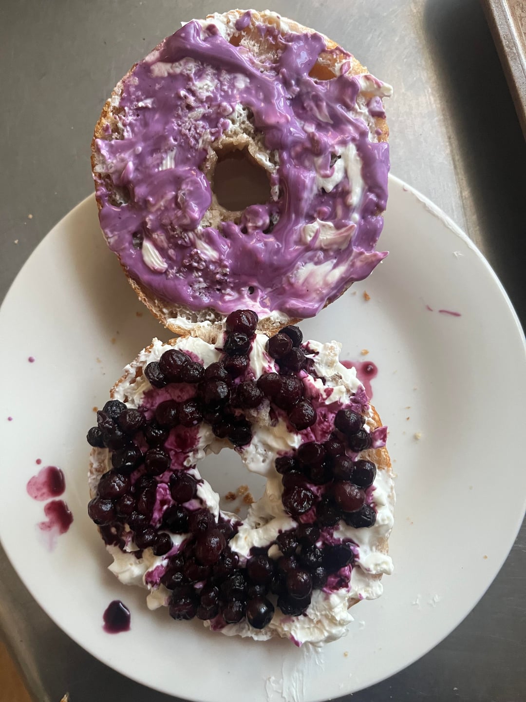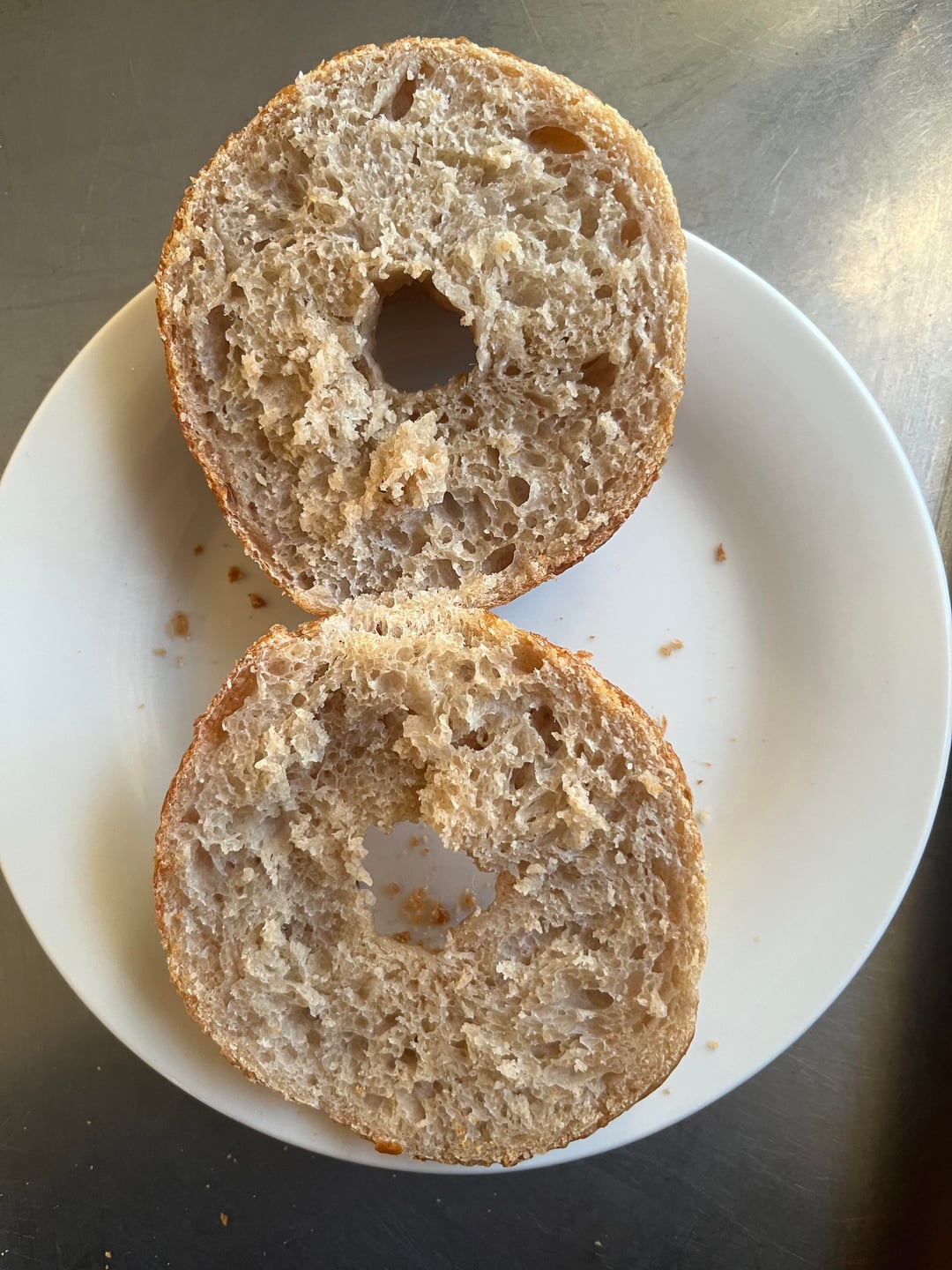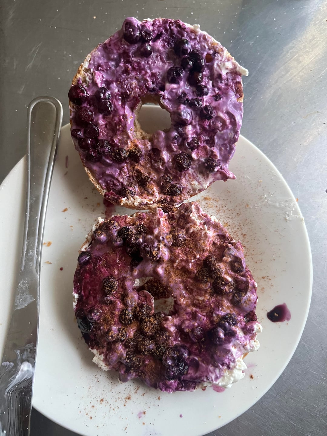 First time using diastatic malt powder. Perhaps a little darker on the outside than some people would like but the crumb is nice and proper imo. I like the crunch of the outside so these are to my taste. Pretty dang chewy and crunchy. Cooked down a handful of frozen blueberries to go with the cream cheese