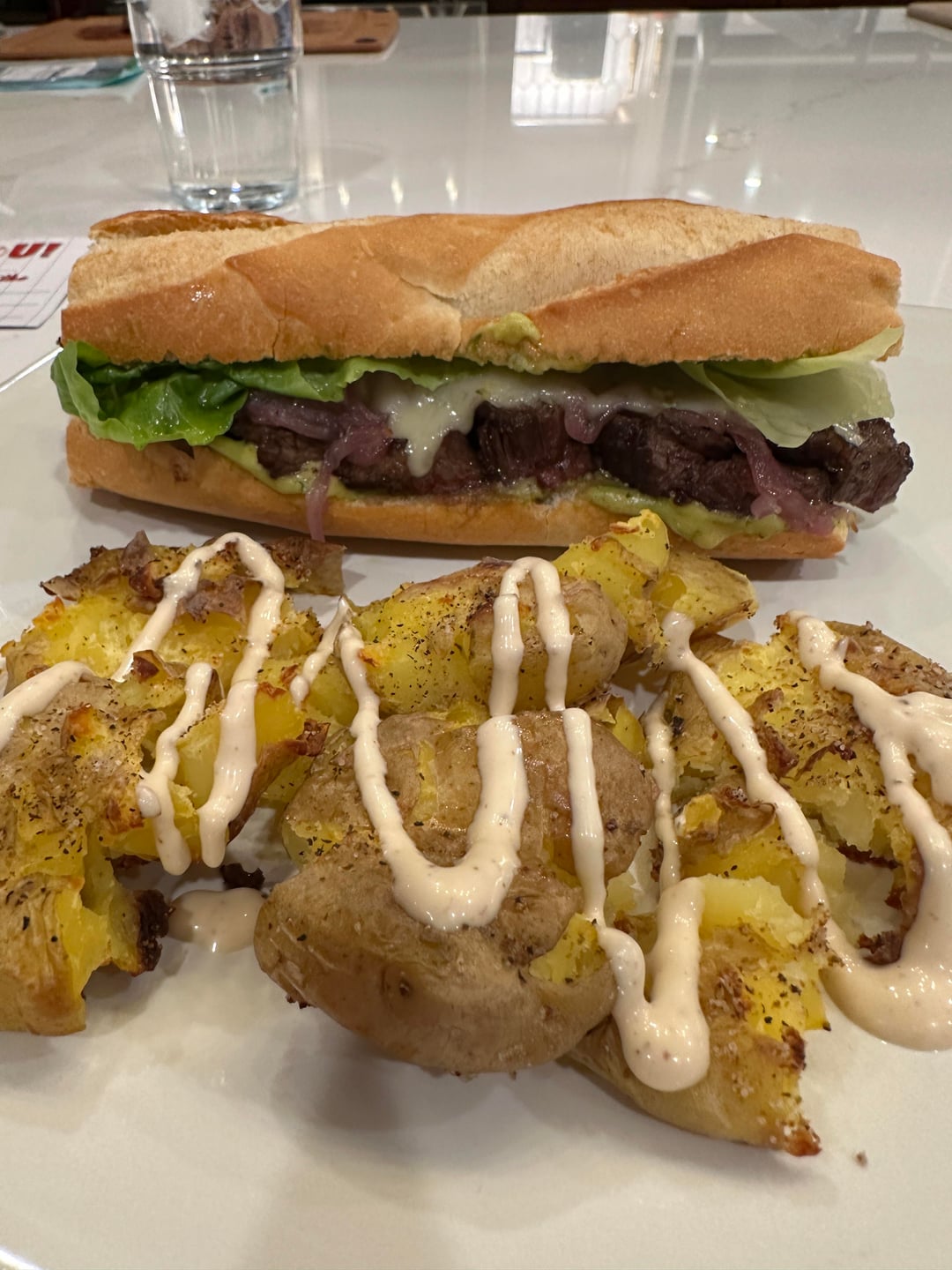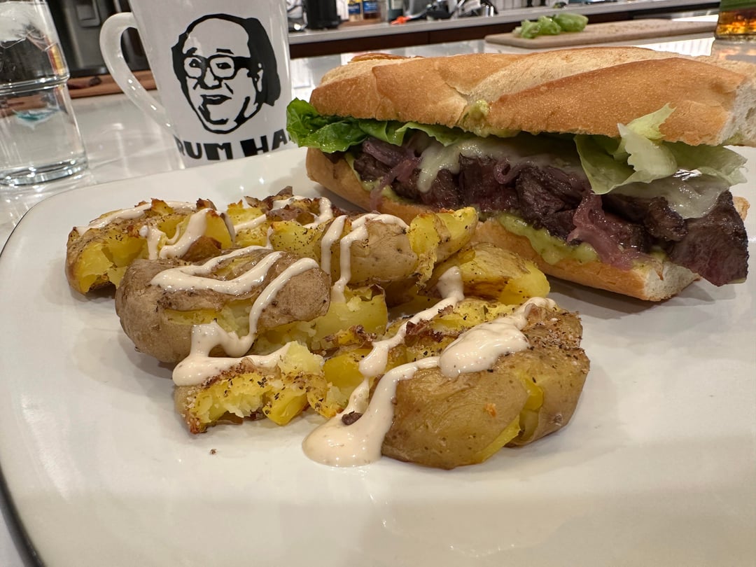 Had a fresh baguette and some flank steak, so made a sandwich with gruyere, pesto mayo, caramelized red onions, and a little romaine. I should have taken a close-up after taking a bite, but it was too good and couldn't think straight. Made some smashed potatoes with garlic aioli for the side.