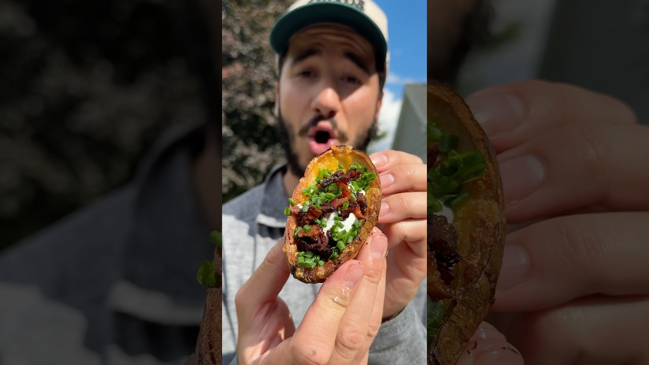 Loaded potato skins and wash them in the stink. Poke some holes. Ters on the top rack. It up. Frozen bacon. Let’s chop it up into bacon bits. Bacon down. Potatoes are grilled. Now we need to get that skin. We don’t want to scoop too much the potato out cuz we want some tater in there. Just like that. We got a potato boat. Now we’re going to fry these up in some beef towel. Forbidden ice cream. Dropping in that hot oil. We’re going to fry them. Get them nice and crispy. They’re sizzling. Once these are nice and crispy, pull them out. Shred that cheddar. Top of some chives. Now we’re going to assemble these potato skins. Keeping it pretty simple here. Cheese melted, nice and crispy. Greek yogurt, bacon, chries. Unbelievable tailgate meal.