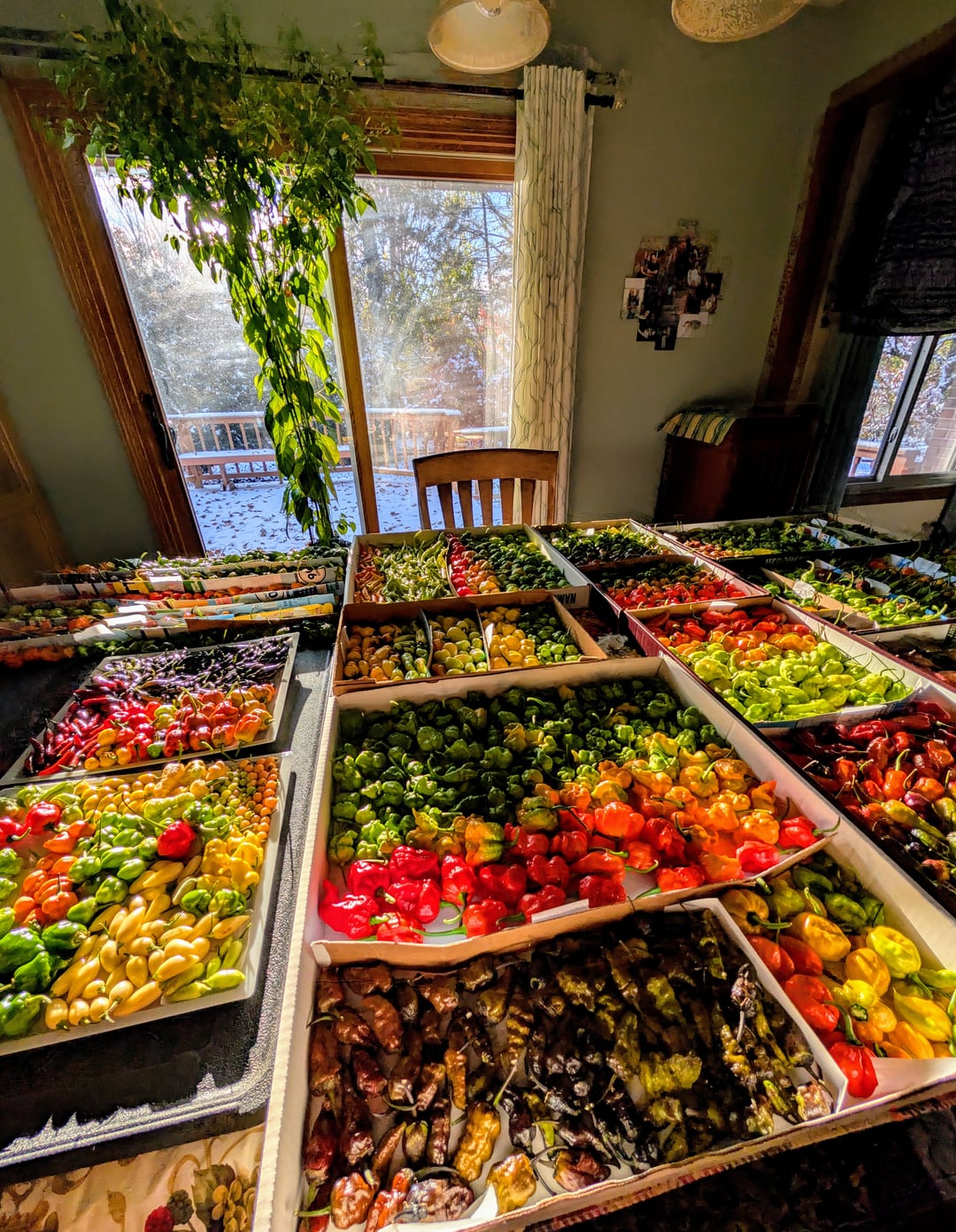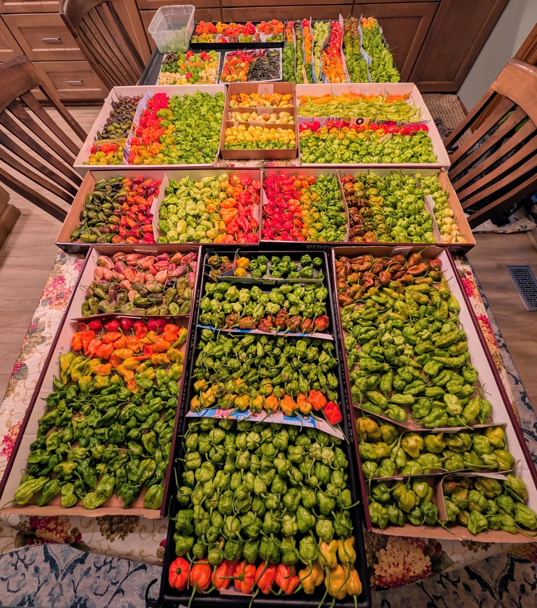 Had to bring everything inside. One odd Guam Bonnies plant still waiting for the ripening. Maybe our Christmas tree. I like to watch most green pods change so they are all sorted by color and type on the kitchen table. I use all the pods that don't color up in a Verde flake/powder mix. It ends up being a real slow heat, one that does not punch you in the face.