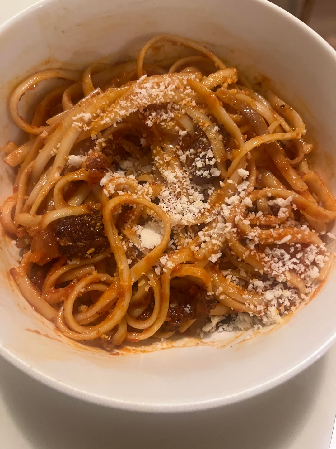 Recipe comment: cook guanciale, set aside, cook onions & garlic in the grease (I know a lot of traditional amatriciana recipes don’t do onions or garlic, but some do, and I wanted them). Add San Marzano crushed tomatoes, add guanciale back, cook on very low slow heat for 2 hours. Cook linguine (again, not traditional amatriciana pasta but it’s what I had), add pasta water to sauce, finish pasta in the sauce, add freshly grated pecorino Romano.
