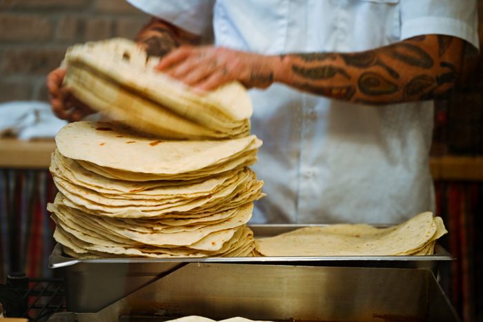 The first problem presented itself early in the process: Prior to this, he didn’t have any professional experience working with dough. “What I did know was how I wanted it to taste — I was chasing the memory of being a kid in Juárez and El Paso, eating those incredible tortillas,” he says. So he experimented with different flours, fats, water temperatures, kneading times, resting periods, rolling methods, even how long to let the dough relax between steps. “Each time a tortilla puffed just right or tore the way I remembered, it felt like I was getting closer to home,” he says.