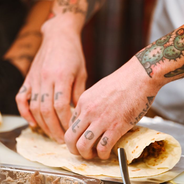 People make the trip to the border of Fort Greene and Clinton Hill because Delgado’s burritos are different from anything else in the city. They’re Juárez-style, longer, slimmer, and far simpler than their rice-and-cheese–stuffed, “guac is extra” Americanized cousins. For one thing, there is no rice. Just a thin layer of beans and a spoonful of slow-simmered guisado in one of four varieties: pork braised in red chile, beef and potatoes in salsa verde, frijoles con queso, and chicken mole.