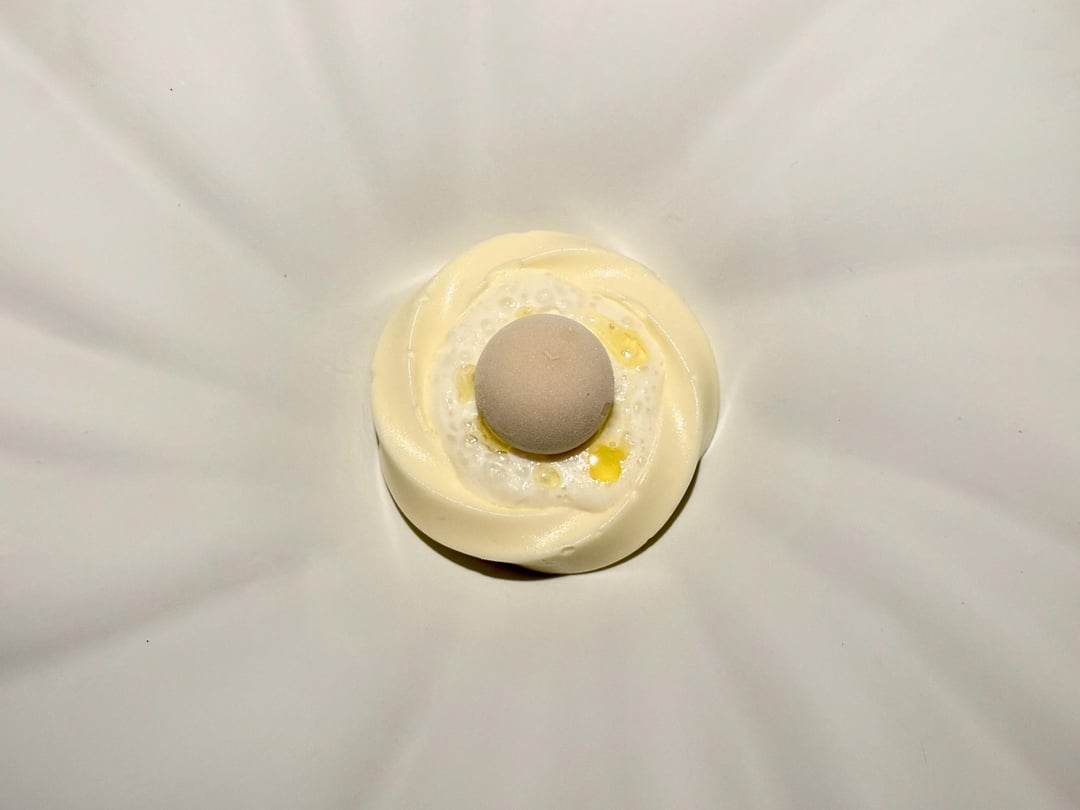 An awesome opening bite. A beignet with layered flavors of malty bread, earthy truffle, and funky cheese, balanced with vinegar and a bit of allium. Great combo of crispy, chewy, and creamy textures.