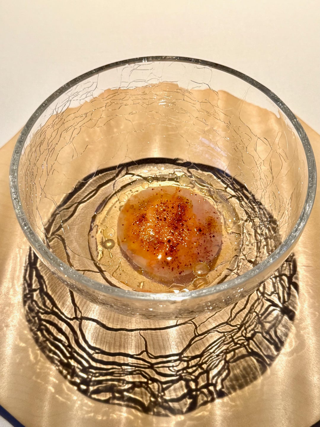 An absolute banger. The tomato water brought umami and acidity. The thin disc of raw shrimp was sweet and had a pleasant gummy texture. A totally unfamiliar combo of flavors that worked really well.