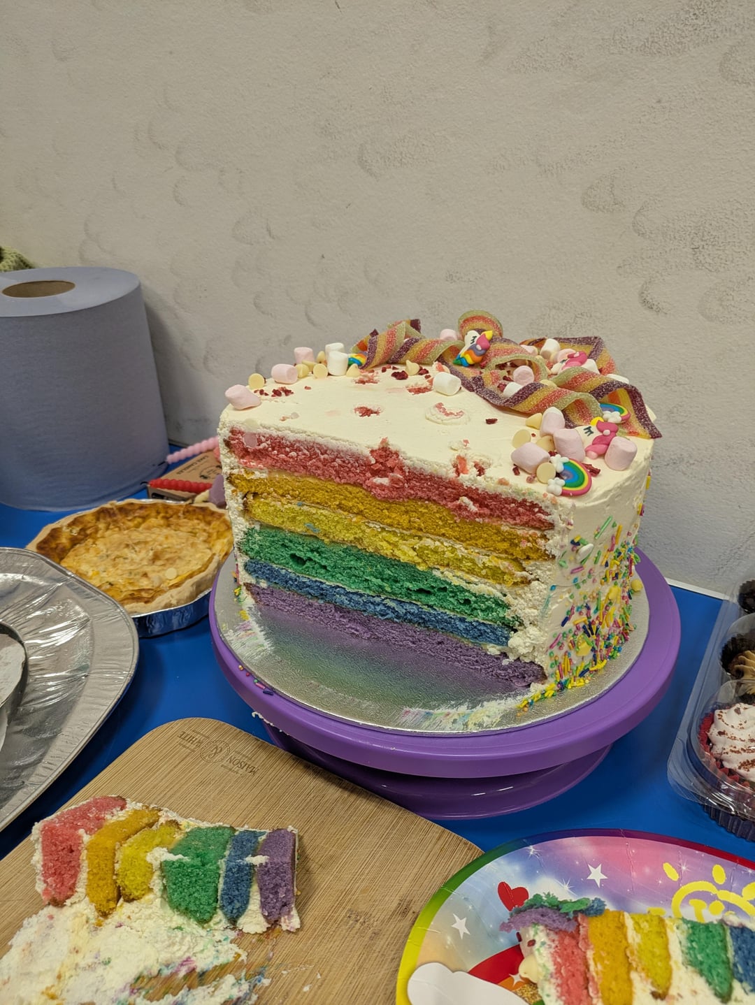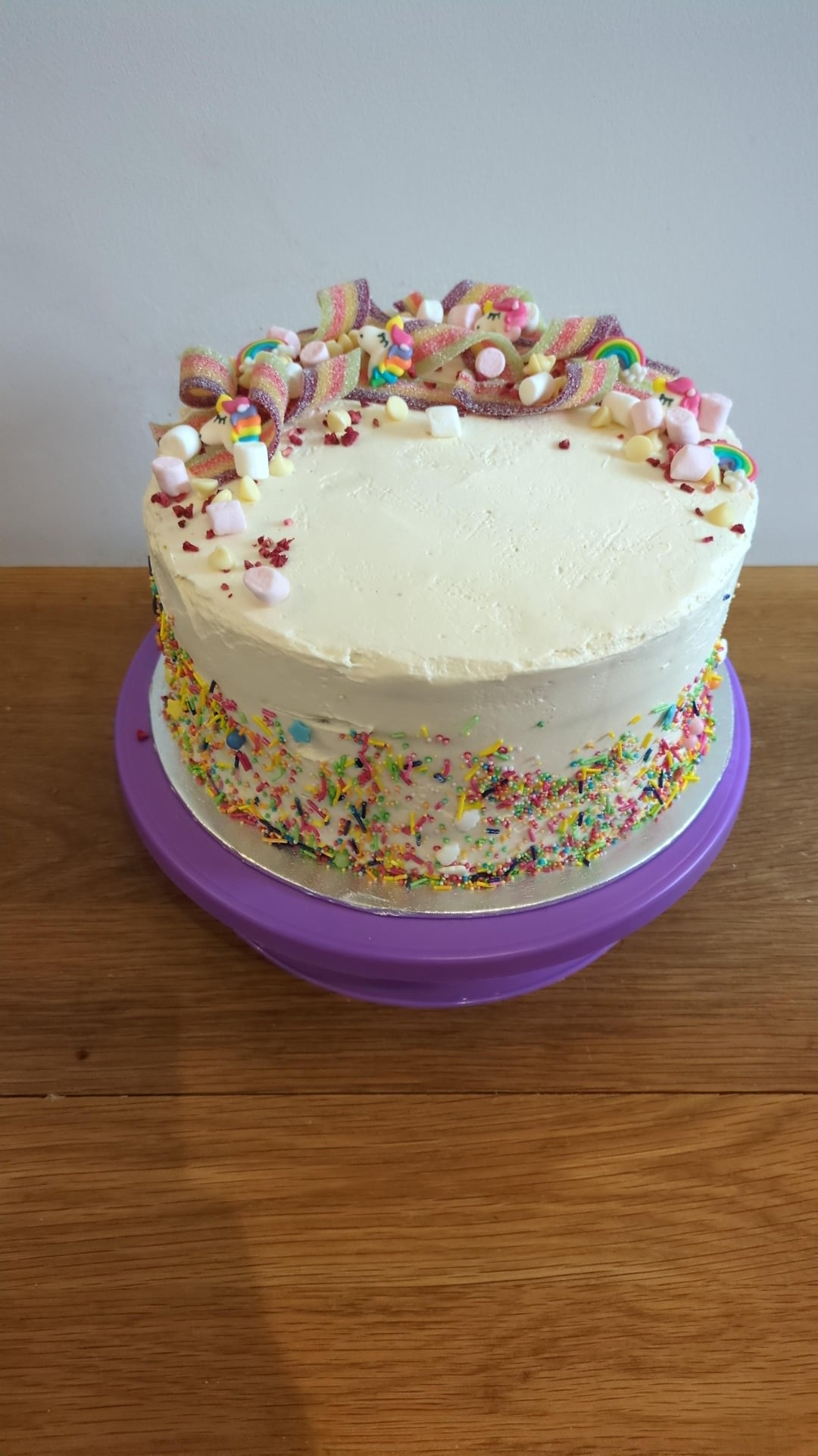 The biggest cake I've made and the fourth birthday cake I've made so far. I am happy with how it turned out but I ran of time to decorate and smoothen it properly. It was light and moist but I think it could have done with a bit more filling. It got eaten and my daughter liked it, which is the most important thing.