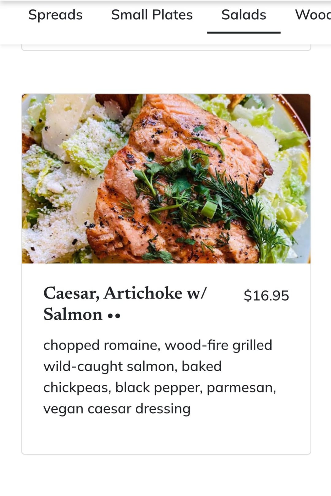 Here’s the resturaunt’s description: chopped romaine, wood-fire grilled wild-caught salmon, baked chickpeas, black pepper, parmesan, vegan caesar dressing.Two photos are from Yelp. Thinking between 700 and 800? Thanks!by swampprincess2019 2 Comments Sad_Awareness_809 3 months ago How big was the salmon u would say? Sad_Awareness_809 3 months ago I would also say around 800. Because of parmesan, oil and dressing. The rest is quite low in calories
