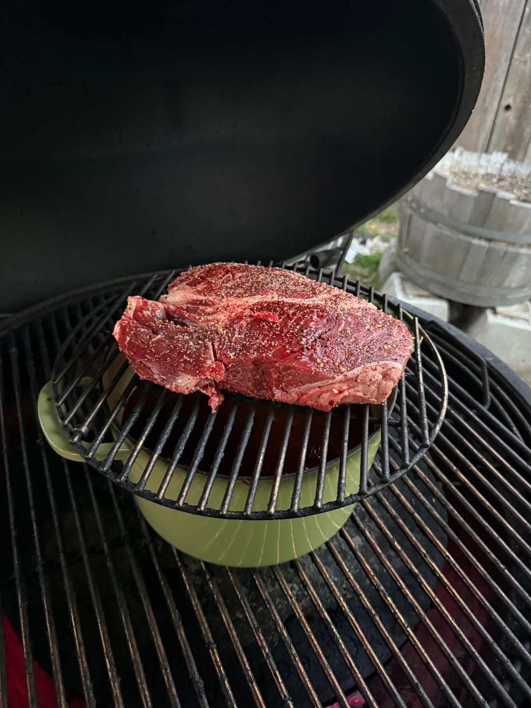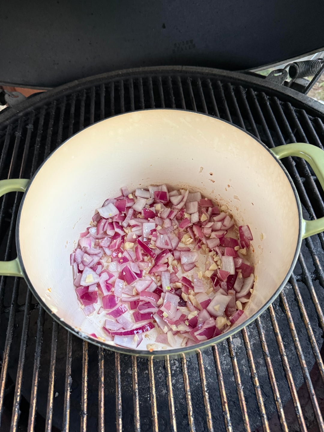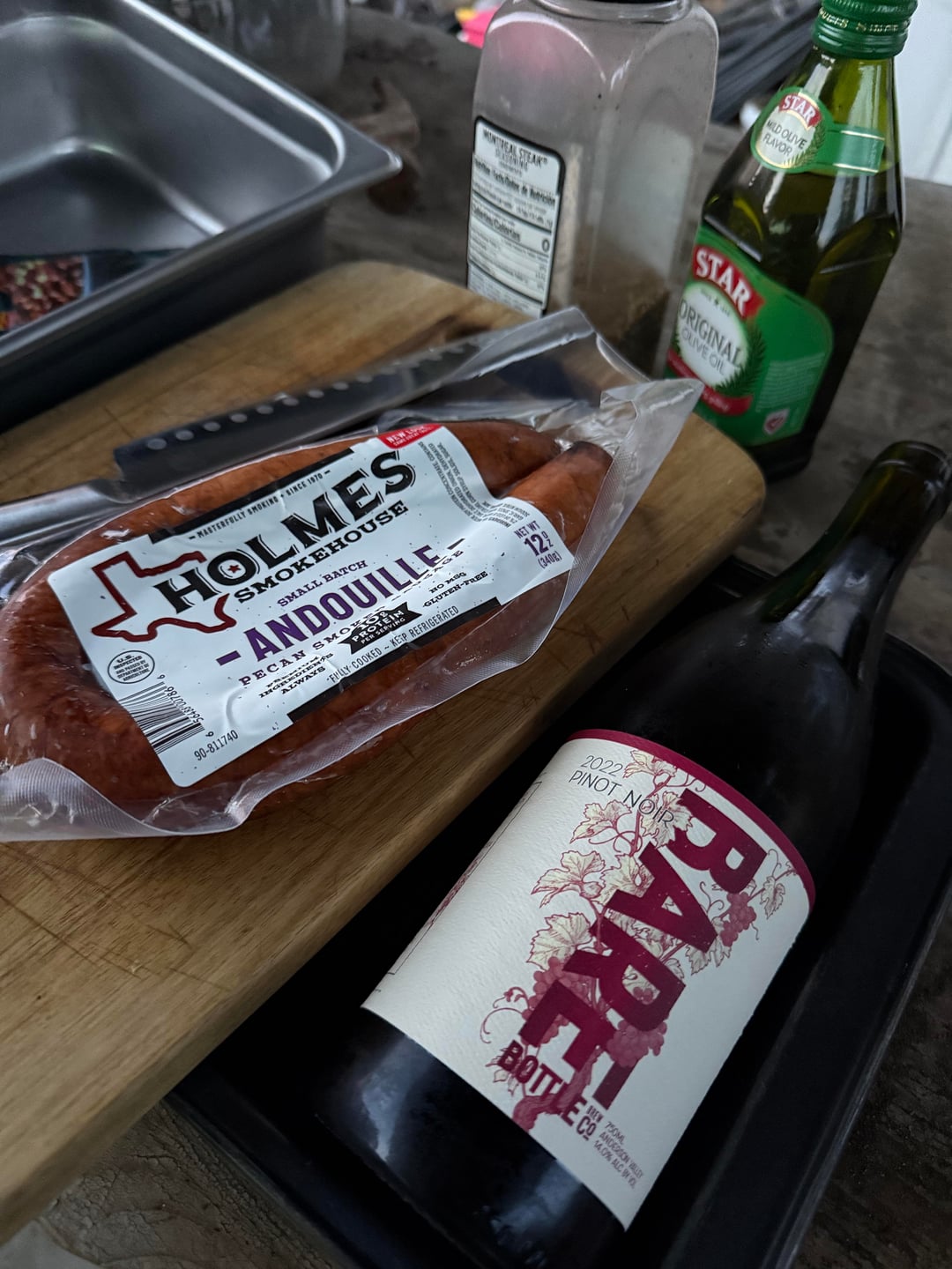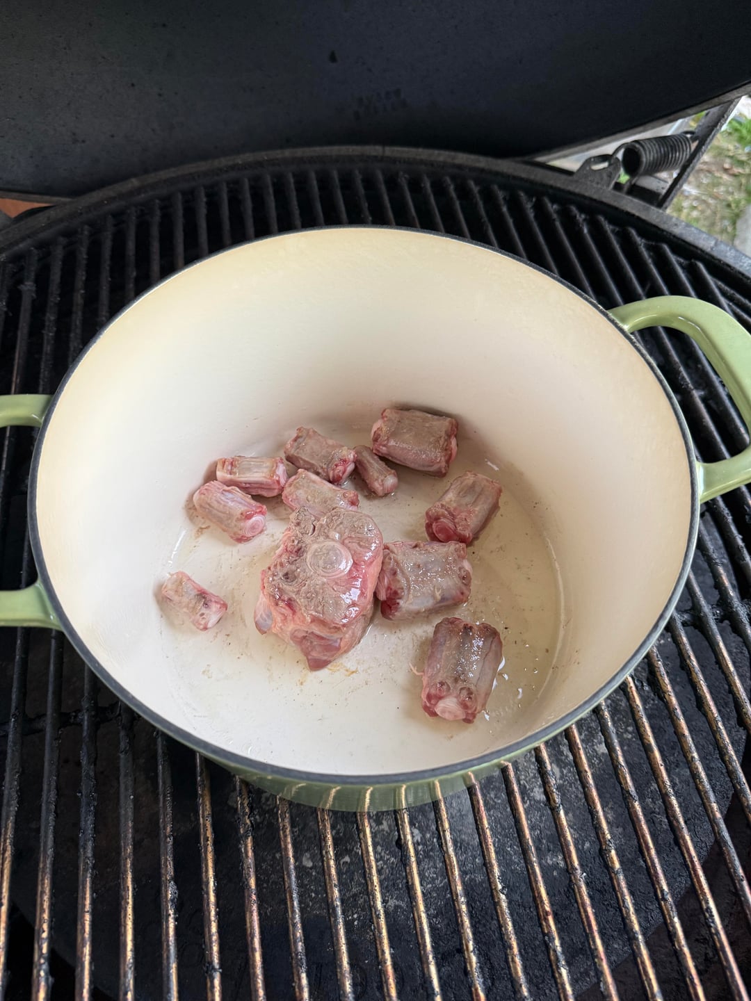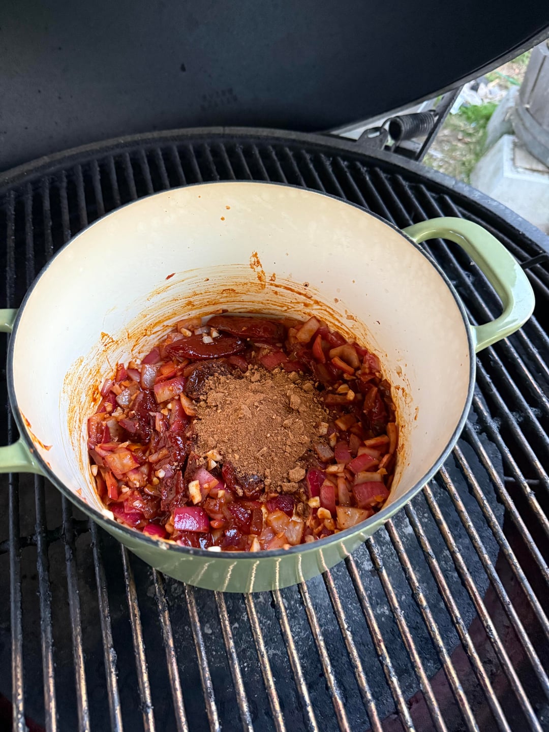 Browned the oxtails. Then used the juices to sweat the onion and garlic. Added spice packet 1 and chipotles. Then deglazed with the stout beer. Added my beans and tomatoes. Then smoked the chuck on top for 1.5 hours. Sliced andouille a 2nd spice packet and then braised the chuck for another 1.5. Pulled and shredded the roast. Added it back in. Let it marry for another 30min.