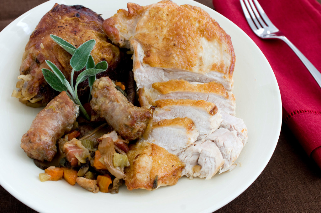 - In a large roasting pan, put thighs in corners, browned side up; there should be room for breasts all in one layer. Fill space between thighs with vegetables; leave breasts out for now. Add mushroom soaking liquid, leaving any sand and grit behind. Add stock or water as needed to come about halfway up sides of thighs.