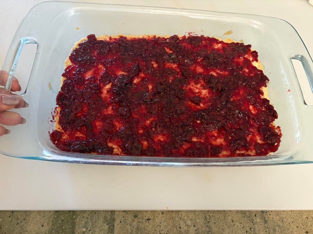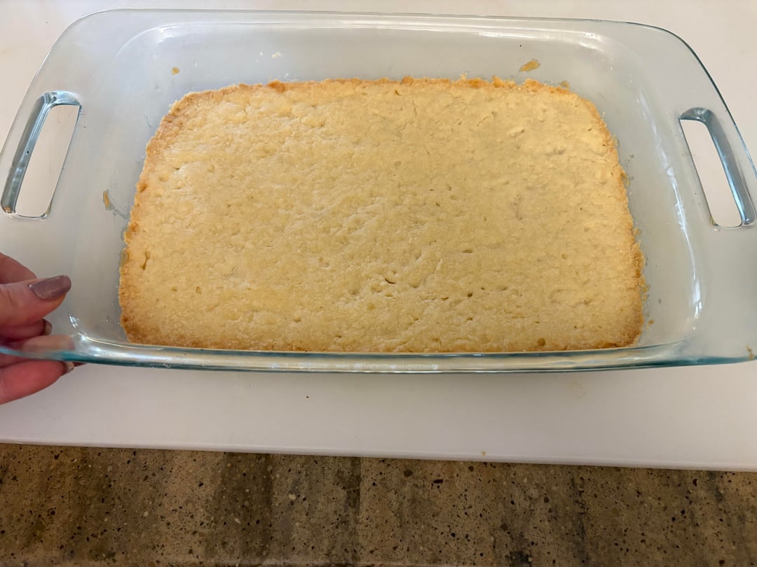 Photo Two: Step one of the bake. Make a shortbread crust in a 9×13 glass baking dish. Bake until light golden brown and allow to cool completely.