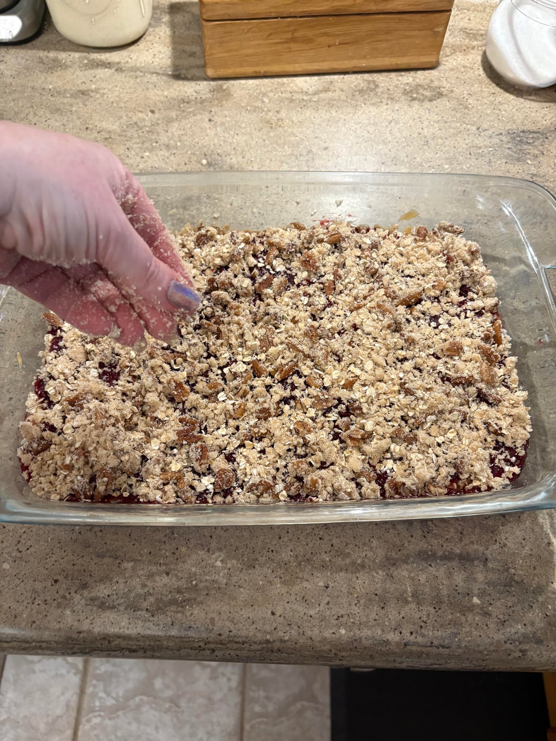 Photo Four: Step three of the bake. Add your favorite crumble topping. In my case, I did the cheaters crumble (tee hee) recipe below. Return to oven and bake at 350 or until you like the way your crumble looks.