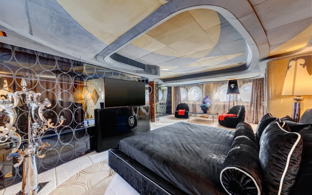 Later refits took it from minimalist futurism to full-blown glamour, with stingray skin finishes, mirrored panels, and Cavalli-inspired furniture.