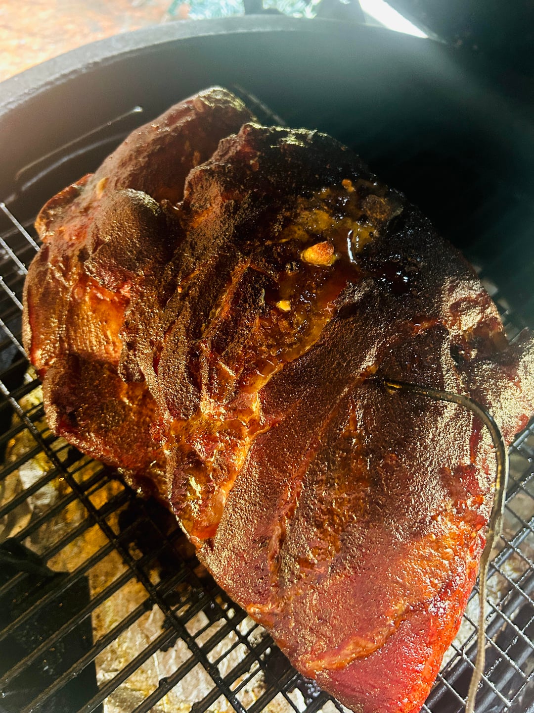 Pork: I’ve done hundreds of pounds through the years and awhile ago settled on the same method, which is to smoke a bone-in shoulder at 250 for 8 hours over apple, then braise in a covered foil pan for the stretch run to 204. I don’t care what the temp is at 8 hours. It was 153 yesterday and can be 170+. I use Malcom Reed’s THE BBQ Rub for the shoulder, usually in the 9-pound range. For the braising liquid, I use a bottle of Blue’s Hog Original. Pour half into another container and replace with the same amount of apple cider vinegar. Top off the extra container with vinegar and now you have two delicious, thin sauces — one for braising (use the whole amount) and one to squirt on individual sandwiches. In building the sandwich, I put a dill pickle slice on the bottom of a fluffy bun topped with a generous portion of pork and that squirt of the new sauce we just made. I wrap each sandwich in foil (get individual wraps at the Dollar Store) for a few minutes to get a nice steam. Tip for new Eggers: Save an empty sauce or rub bottle. They’re almost always really well-made and come in handy for your own homemade concoctions.