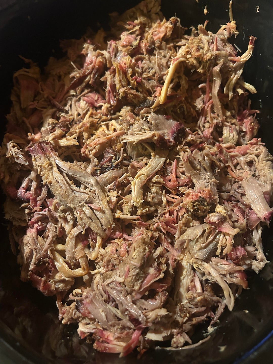 Wrap-up: I work on one Large Egg. With dinner Monday night, I cooked the cheesecake Sunday morning so it could chill overnight. I started the pork at 5 a.m. Monday and it was done at 3:30 p.m, rested and pulled around 5:45. I took a half day and built the mac & cheese early afternoon before popping into the Egg at 5 for an hour, which made everything ready as the guys walked in at 6 👍.