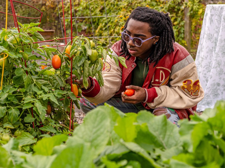 Demitrius Knowles, 17, of Imani Montessori School picks tomatoes from the Brooklyn Heights Community Garden. Credit: Martin B. Cherry / Nashville Banner
