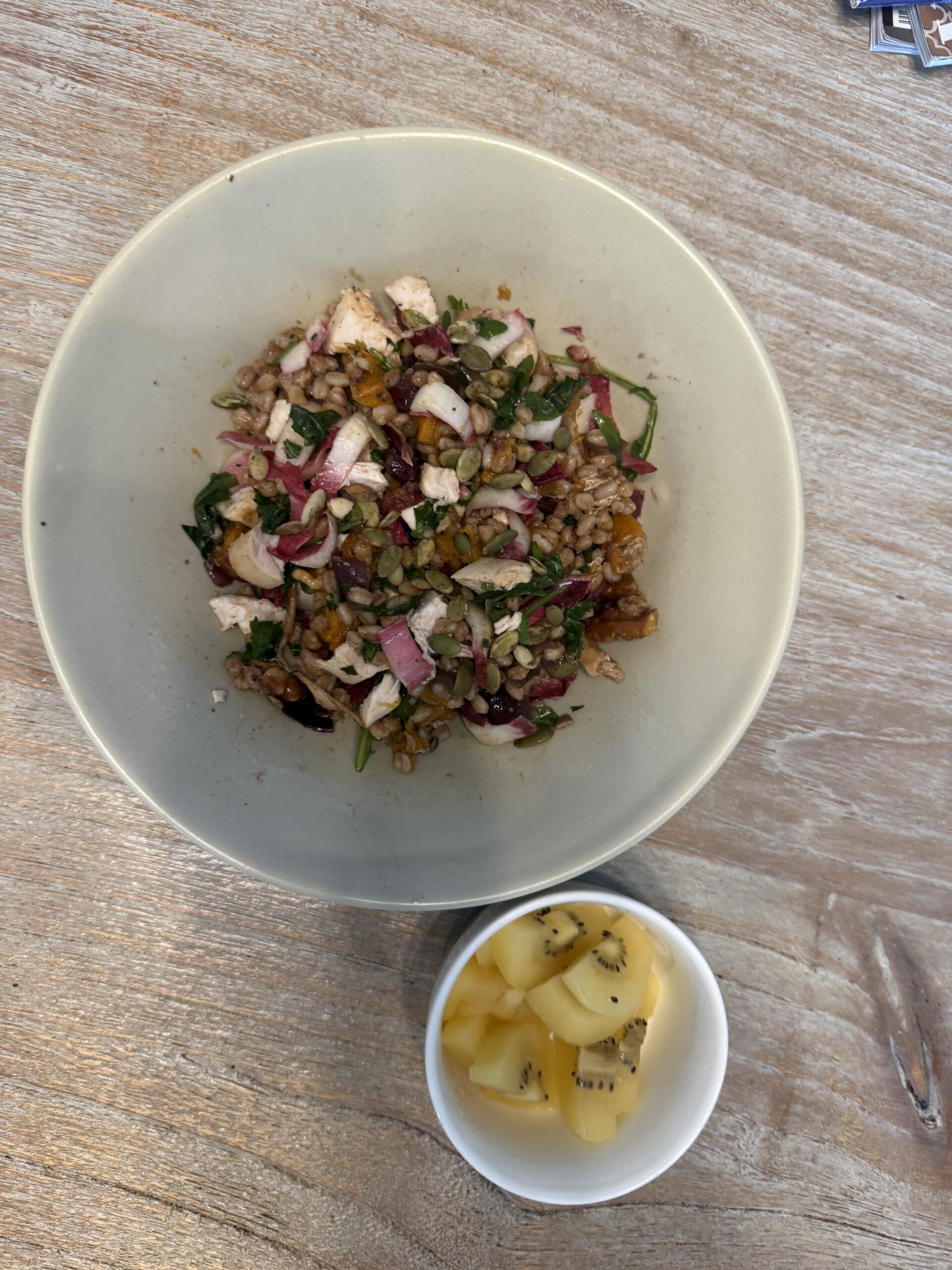 The salad has farro, walnuts, dried cranberries, roasted butternut squash, arugula, walnuts, and smoked chicken. In. A balsamic vinaigrette I think.
