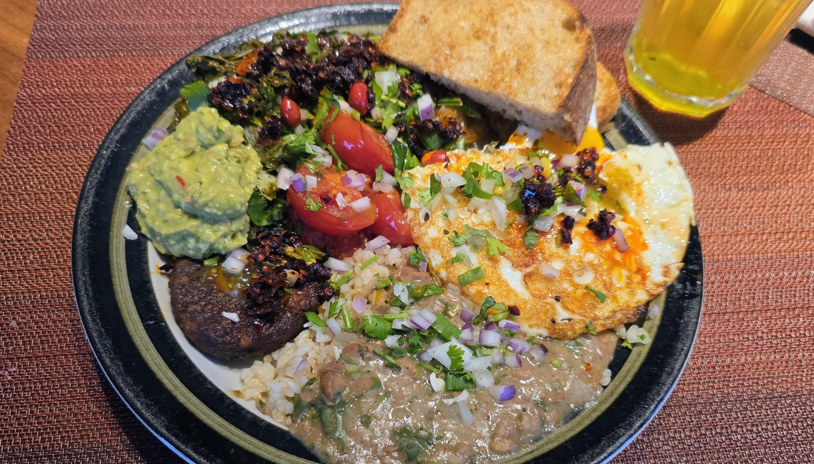 Steamed kale and broccoli with lemon juice, homemade refried beans, brown rice, veggie sausage patty, homemade guacamole, two local eggs over easy, sauteed tomatoes, red and sweet onions and scallions. Topped with amarillo sriracha, chopped raw onion, cilantro, scallion, hot pepper and garlic, tomatillo salsa and chili crisp.