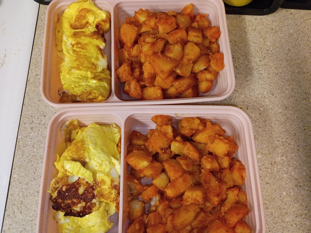2 eggs, 1 slice provolone cheese, 3 sazon seasoned potatoes