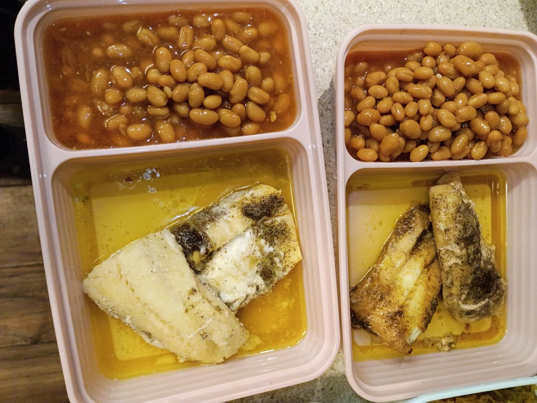 Buttered haddock with pork and beans (canned)