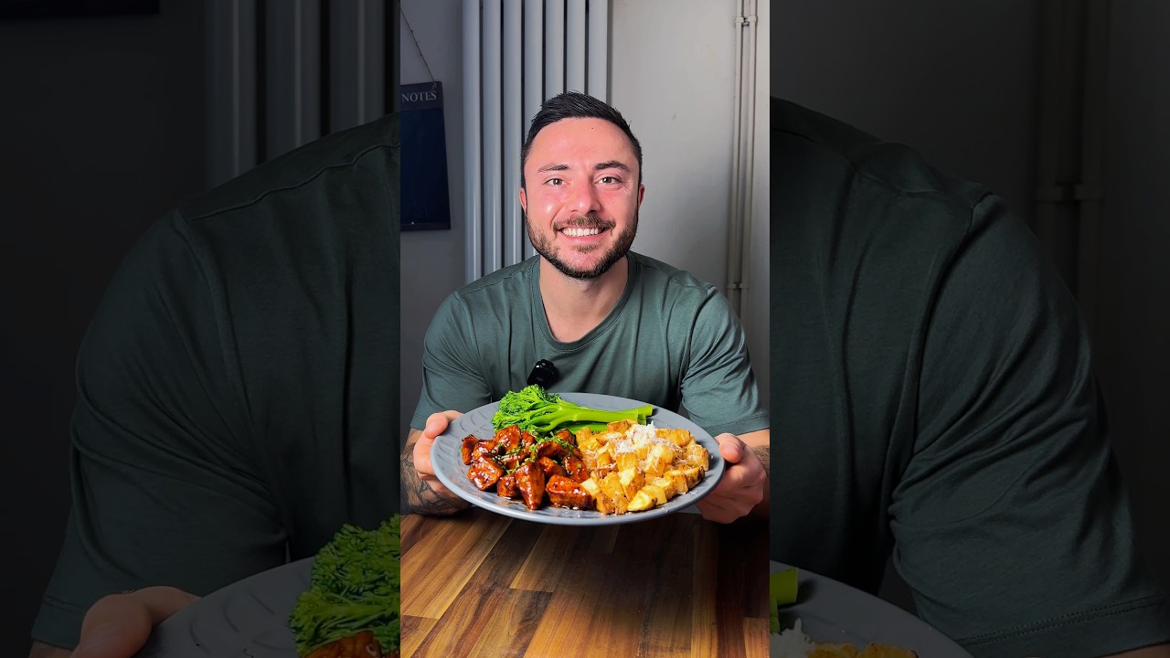 If you’re trying to lose weight but still want food that actually tastes good, you need to make this honey barbecue chicken and garlic palm potatoes. Start by dicing some Maris Piper potatoes. Then transfer them to your air fryer. Season with salt, black pepper, and garlic powder. Spray with oil. Give them a little shake. Then air fry at 180° C for about 25 minutes. Give the potatoes a shake halfway through. Show some parmesan a great time. Then back in the air fryer, get some diced chicken into a bowl. Season with salt, black pepper, Cajun seasoning, paprika, and onion powder. Mixy mixy. It should be nicely coated like this. Heat some oil in your pan. Then add the chicken. Cook for 7 to 8 minutes. Add some low-fat butter, barbecue sauce, and honey. Scrape all the flavor off the bottom of the pan. Once the potatoes are nice and crispy, serve them on your plate with the barbecue chicken and some broccoli. Finish with some chives and a final dust of parmesan. Look at that. That is absolutely banging. Lovely.