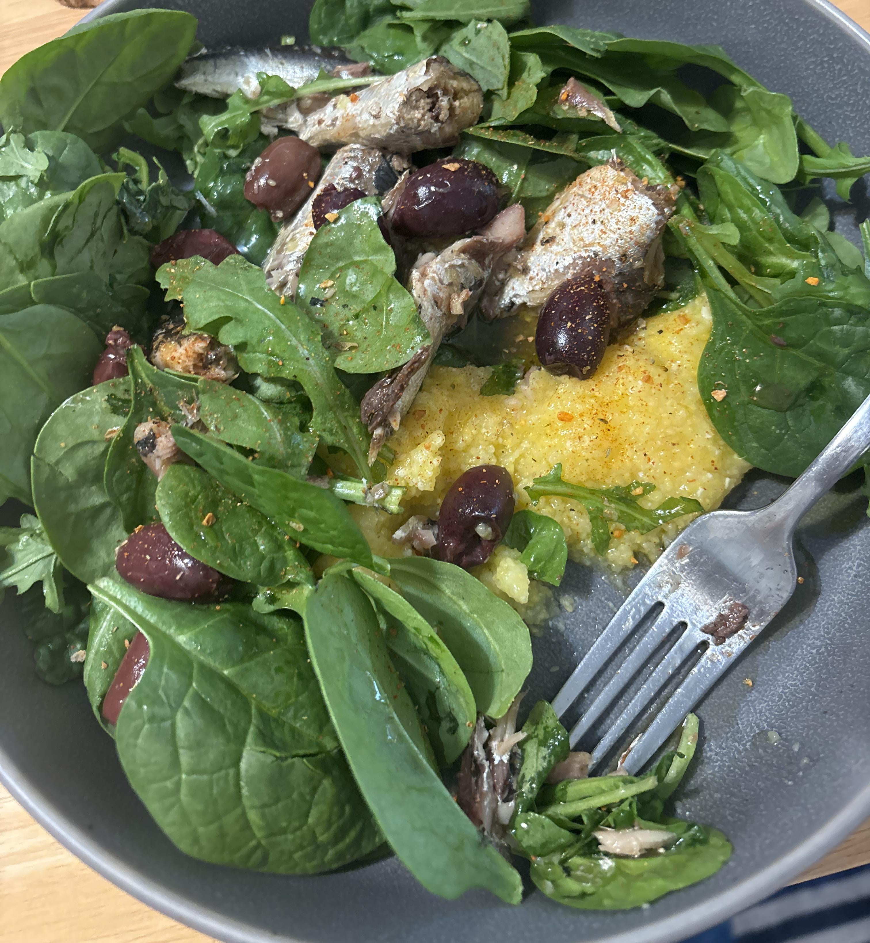A breakfast that my friends do not seem to appreciate…. Greens (arugula & baby spinach), sardines, Kalamata olives, over a bit of polenta with olive oil drizzled on top.