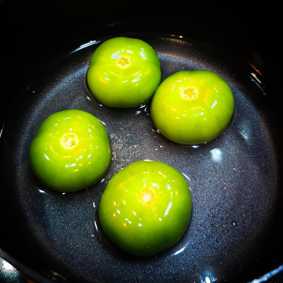 – Gently boil the tomatillos for 3-4 minutes each side. Set aside and reserve a bit of the water.