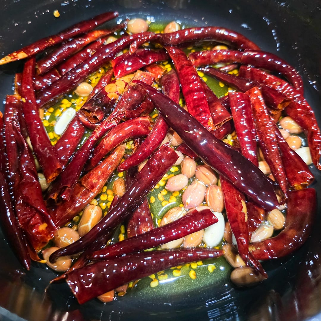 – Heat oil in pan to medium/low heat, then toast arbol chilis and peanuts for 3-4 minutes.