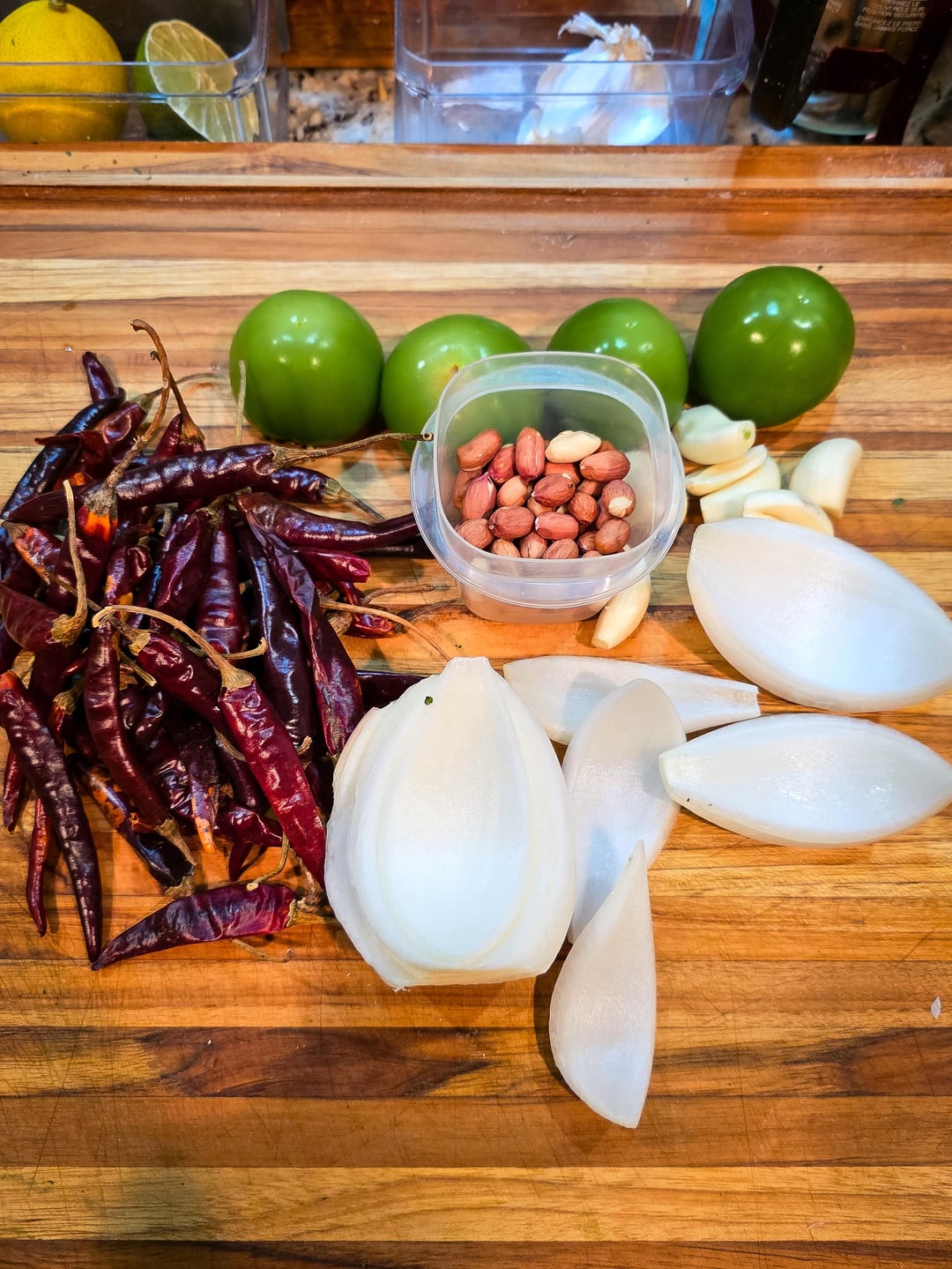 – 20-30 Chiles de Arbol – 1/4 White Onion (Diced) – 5-6 Garlic Cloves – 15-25 Raw Peanuts – 4 Tomatillos – Salt – Water – Canola Oil