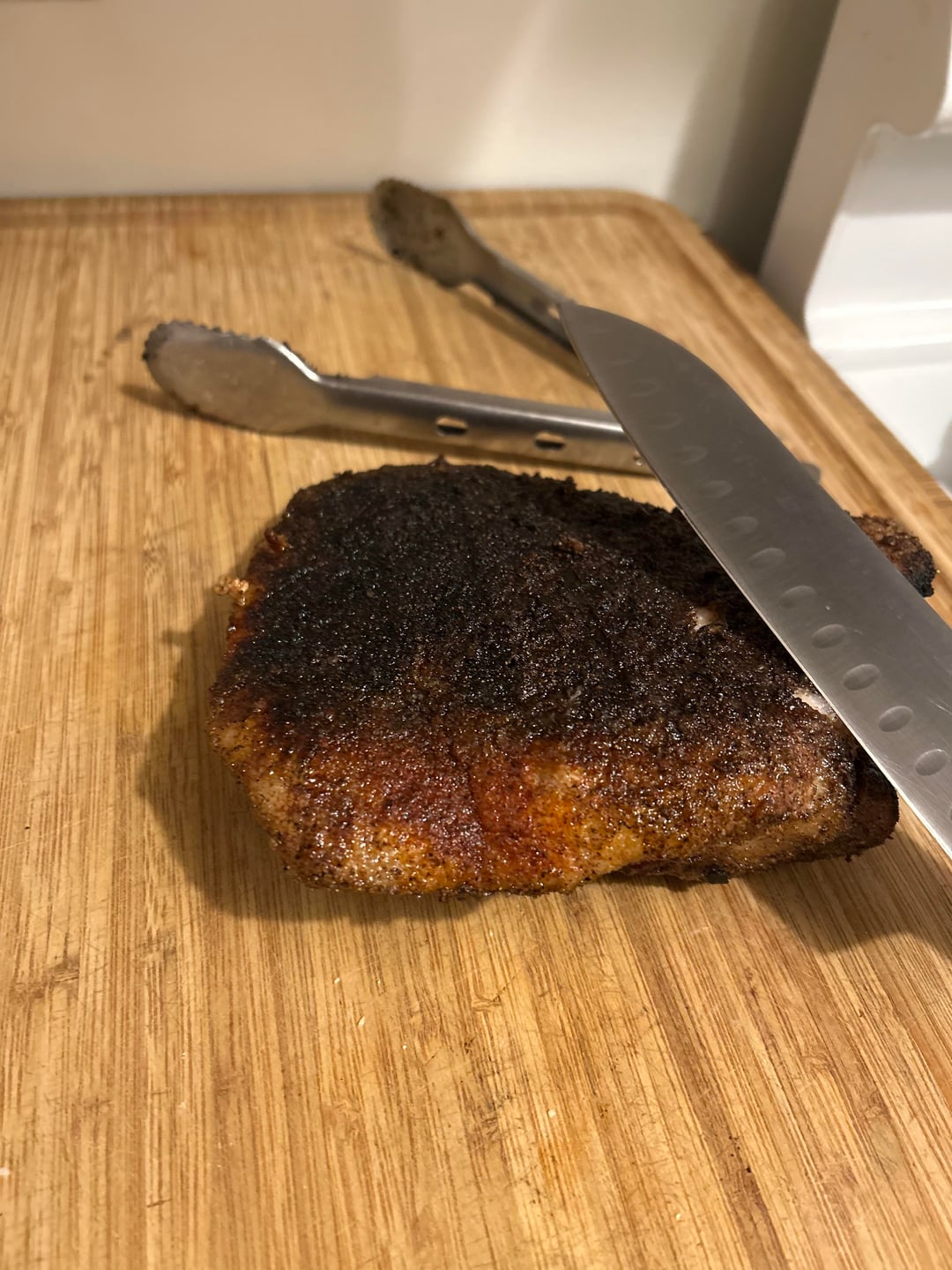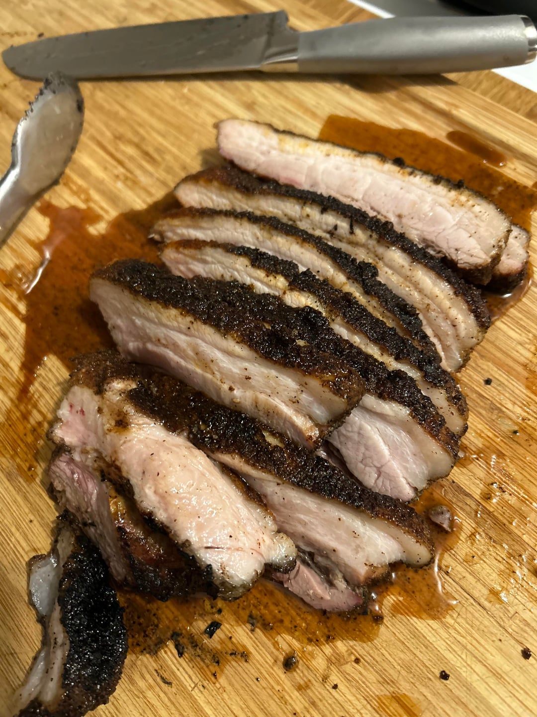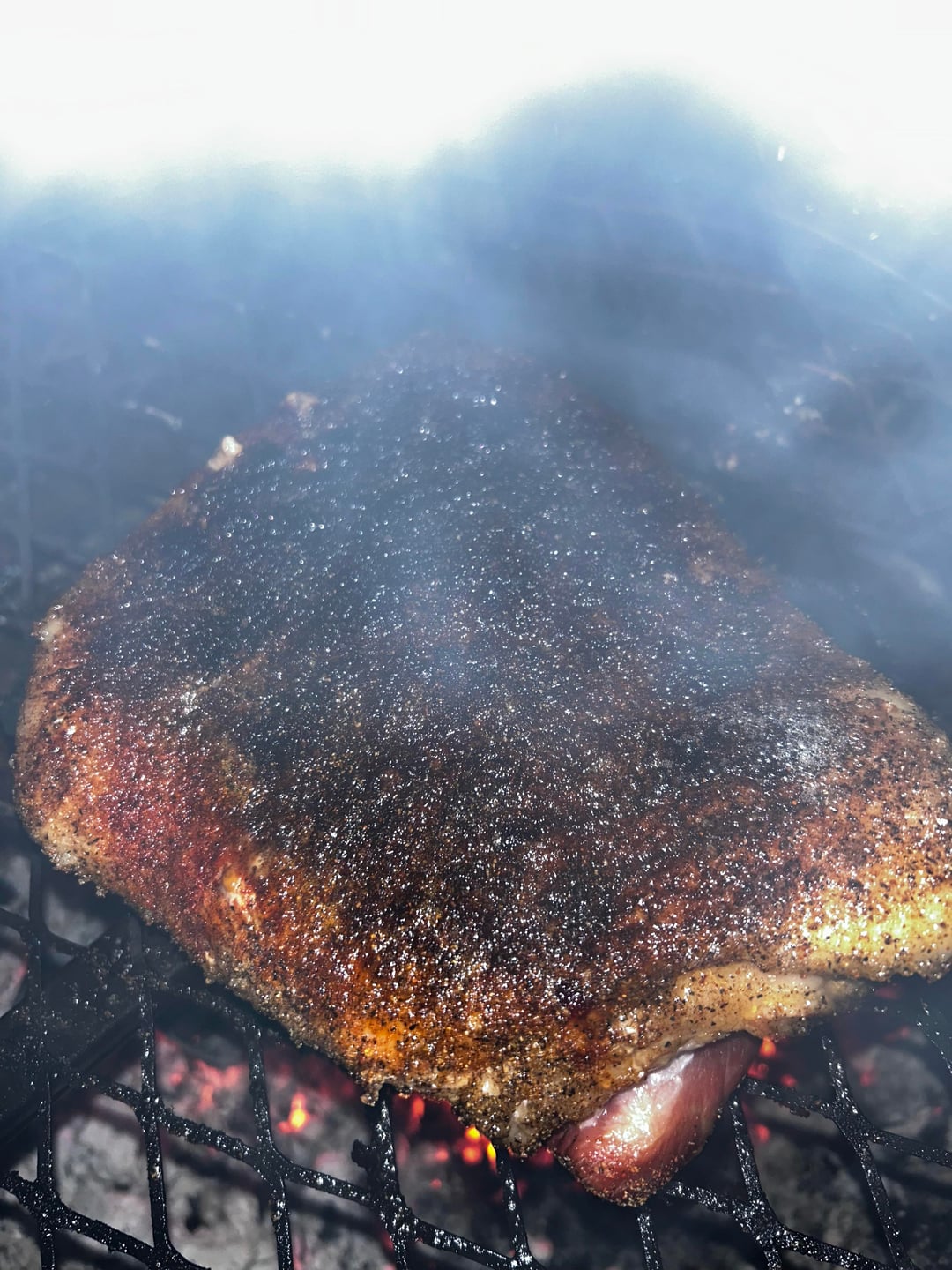 got a pork belly from kroger for $4. seasoned well with s+p, garlic, onion, cheyanne, and paprika. sorry some of the pics are a little smoky. cooked for about 2 hours over hickory wood.