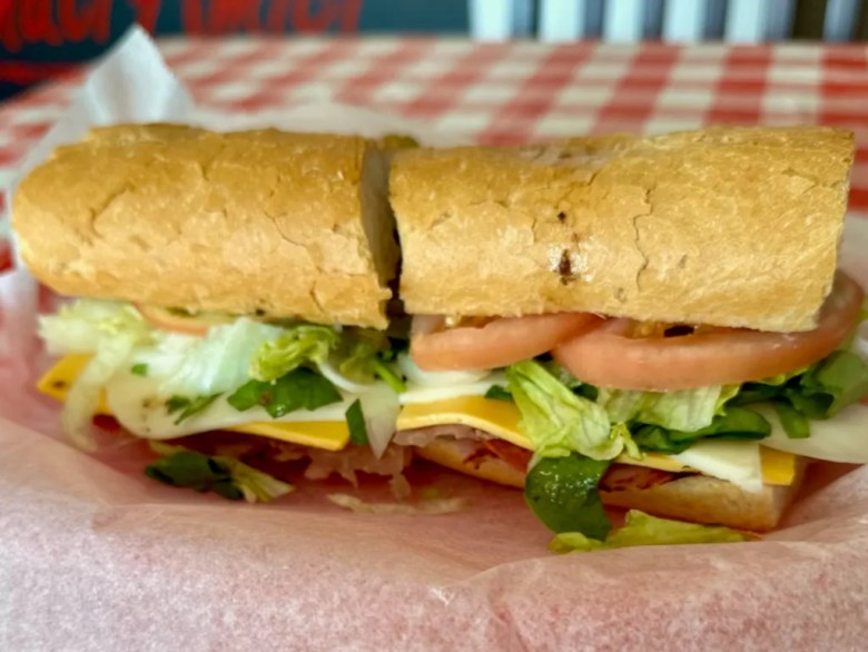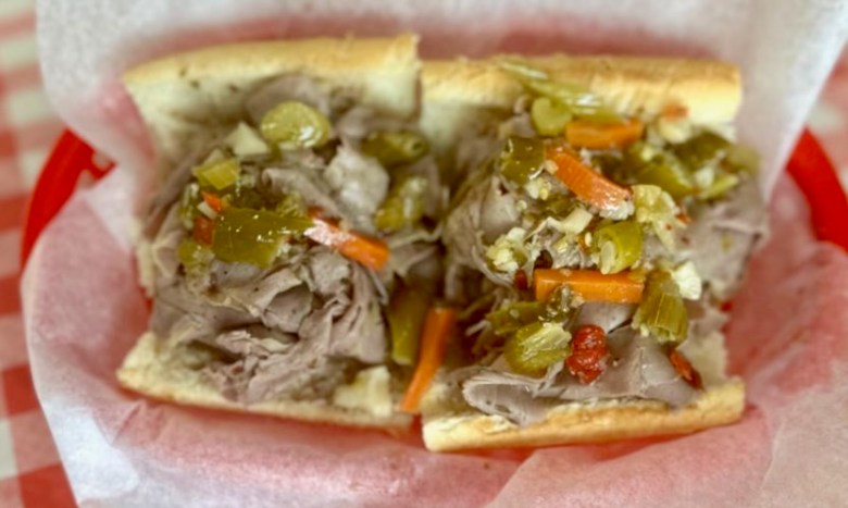 It’s a Dagwood sandwich, Italian style: ham, pepperoni, Italian beef with tomatoes, lettuce, onions, two types of cheeses – mozzarella and American cheese – and a choice of giardiniera or jalapeno peppers.