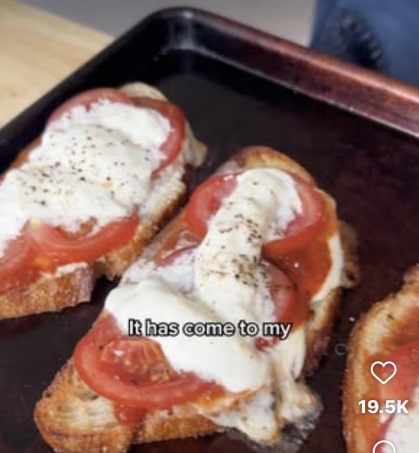 French or Sour Dough bread, sliced tomatoes, whole milk mozzarella, maybe some EV olive oil, I’d add some dried oregano and cracked pepper. It’s got to have garlic some how, maybe in the oil, or break a clove and rub it on the bread. Maybe toast the bread a little before putting the other stuff on. Then toast until the cheese is to your liking.