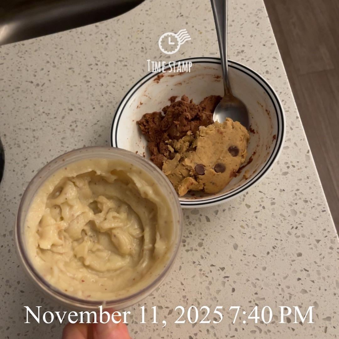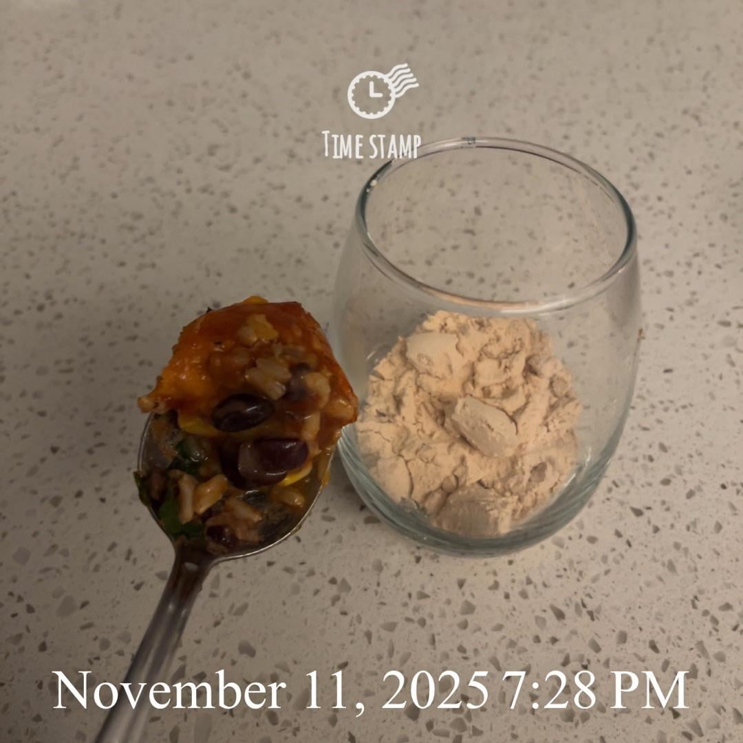 Spoon of bf’s vegan enchilada and another pea protein drink (again, I add water lol 💧)