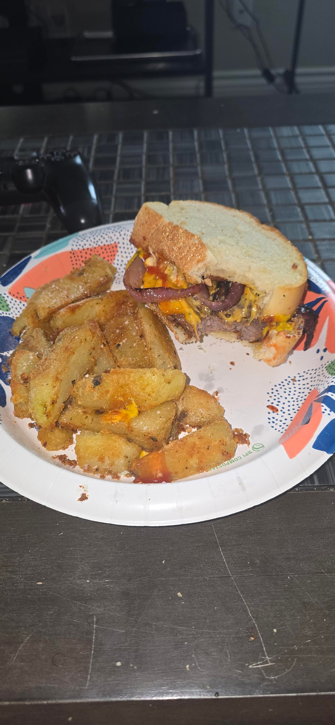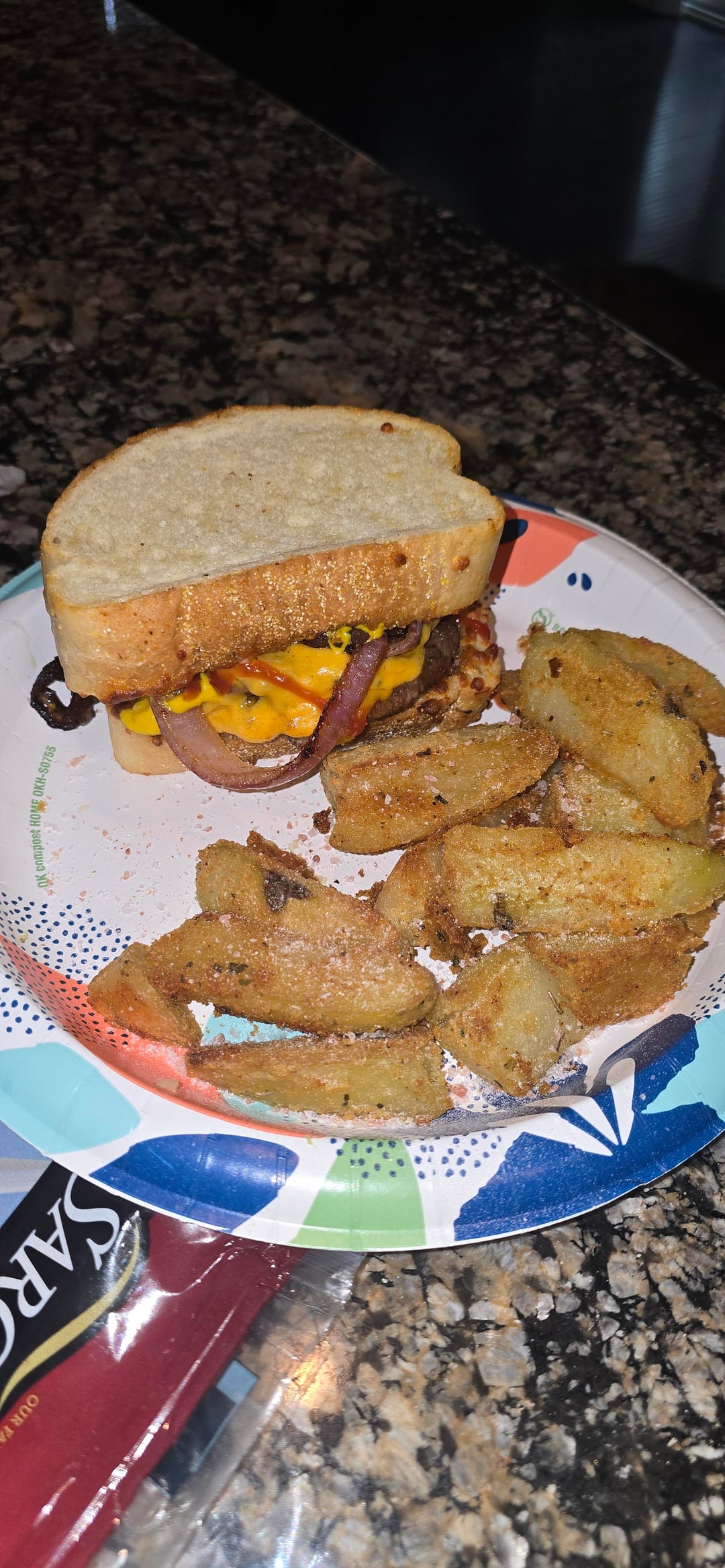 With red onions and homemade wedge fries