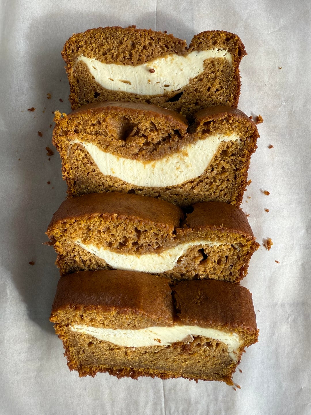 That pumpkin loaf slice with the cream cheese ribbon is calling my name. It looks like the kind you slice thin and then keep going back for just one more piece. The texture looks spot on too not dry at all.