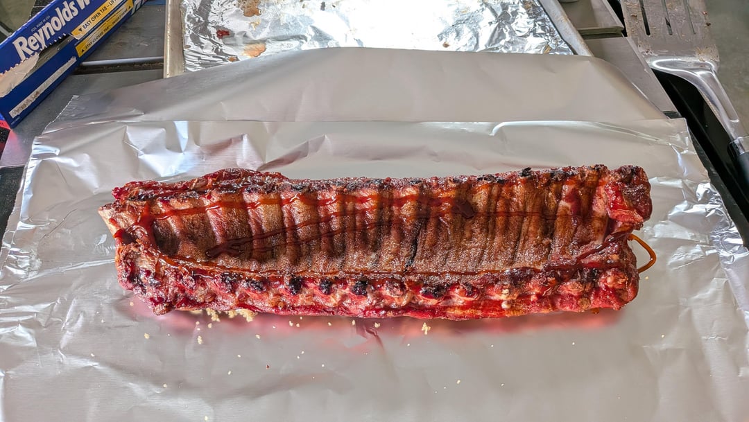 Foil wapped with butter brown sugar and some bottled bbq sauce and returned to the grill for another 1:20hr-ish until I hit 200+. Rested.